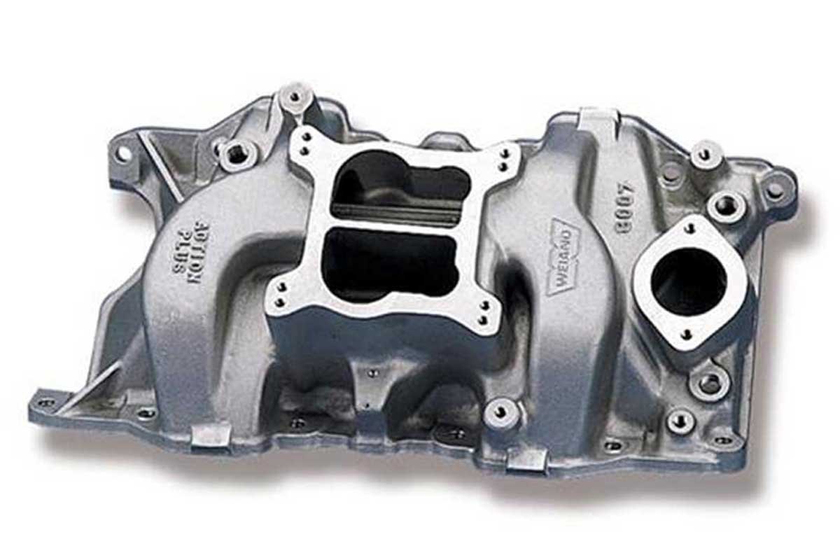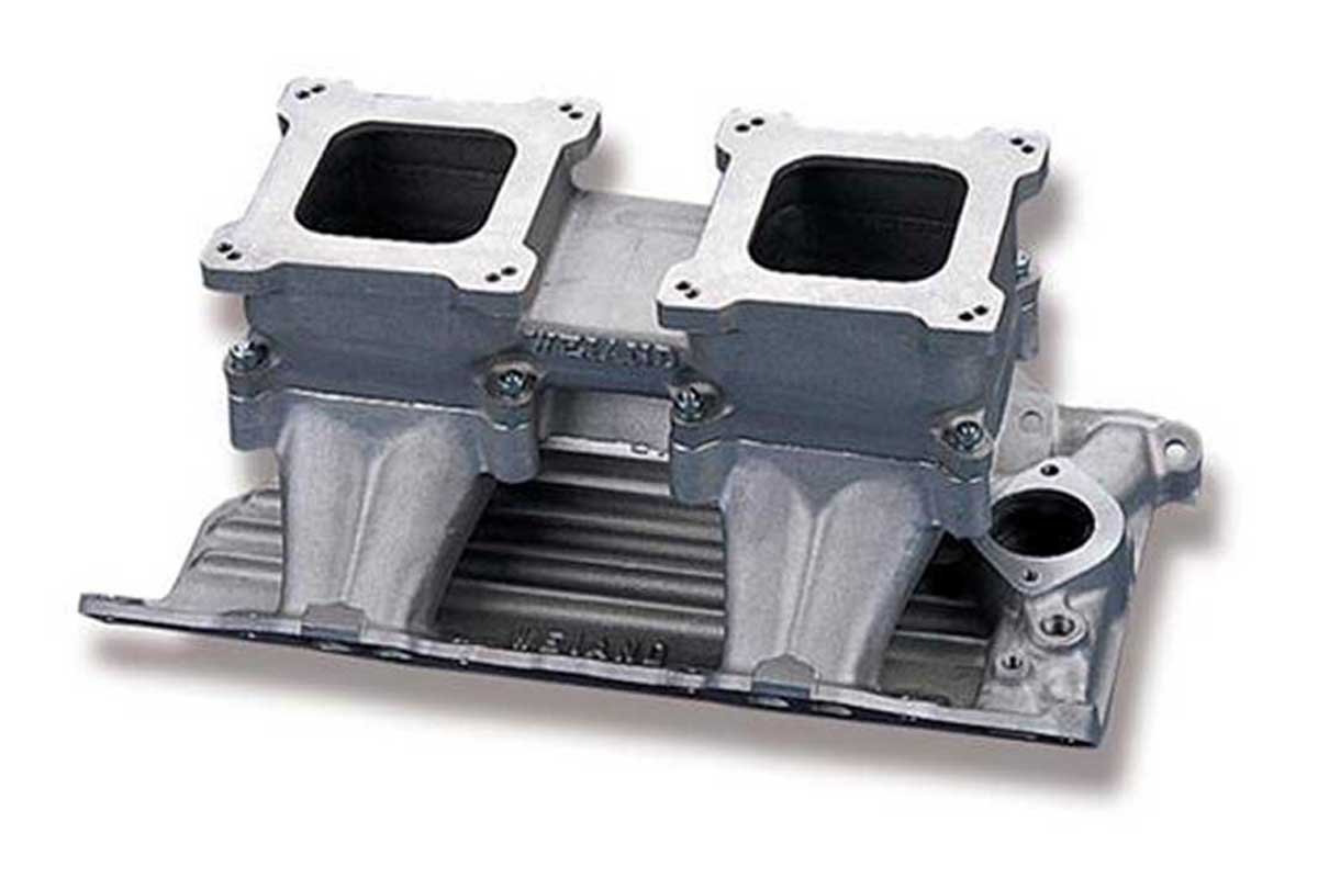 Above Left: Weiand has dual-plane intake manifolds in square- or spread-bore designs for the old school engines. Above Right: If more air and fuel are needed, a dual carb tunnel ram from Weiand will fit the bill.