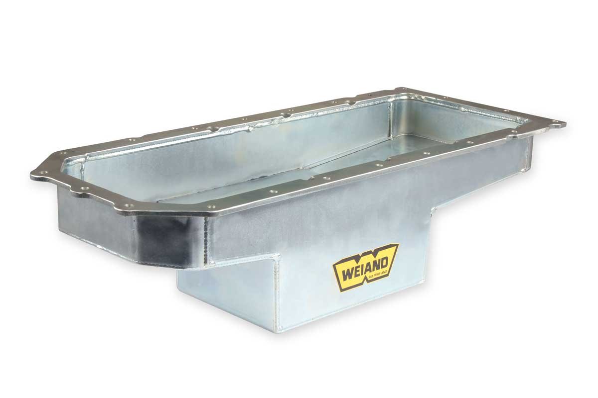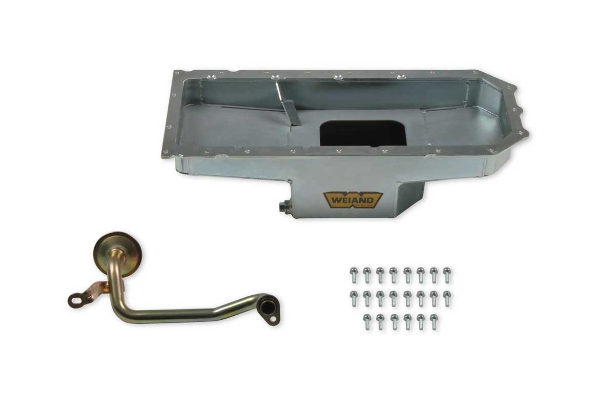 Above Left: Weiand has expanded its catalog with components to swamp Gen III Hemis into muscle car era rides. If the Hemi is a 2009 or newer, Weiand has a pan for the engine. Above Right: An earlier Gen III Hemi will require a different pan.