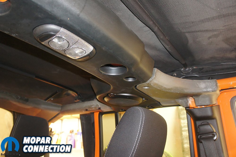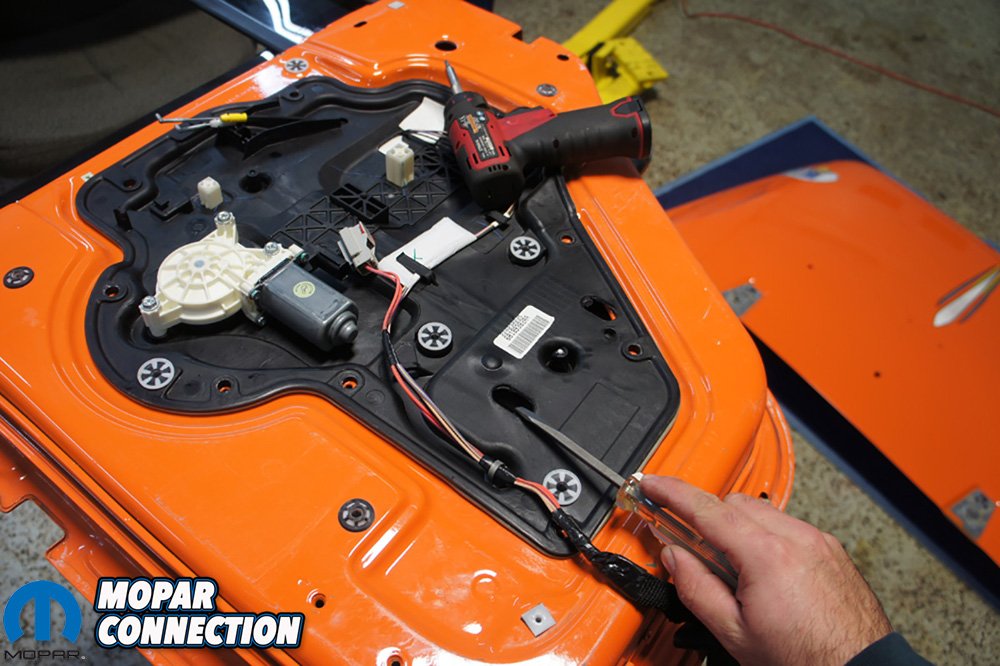 Above Left: Tearing apart the rear passenger door of the Jeep was fairly easy and saved us some money since the body shop did not have to do it. Above Right: There was a hole that we had to cut out to gain access to the release clip for the window.