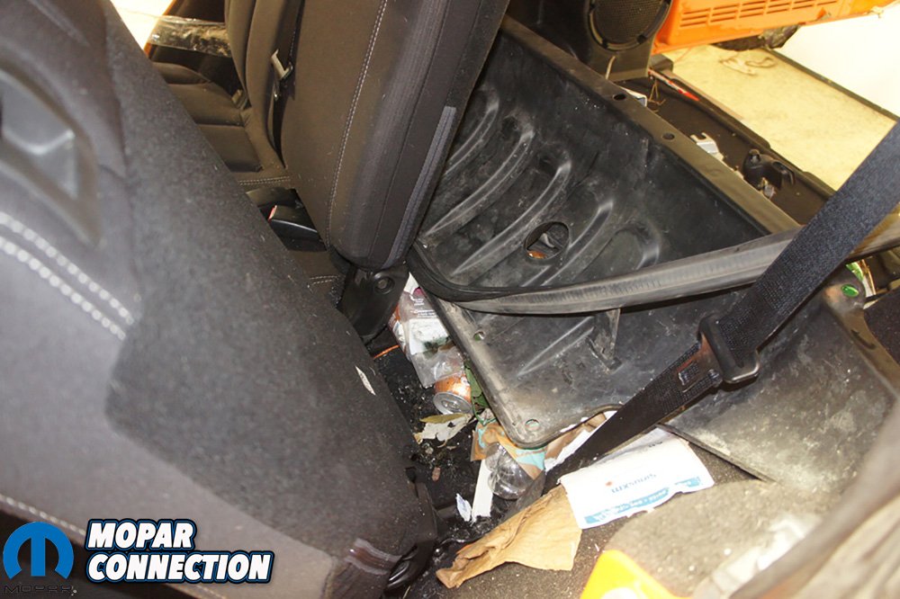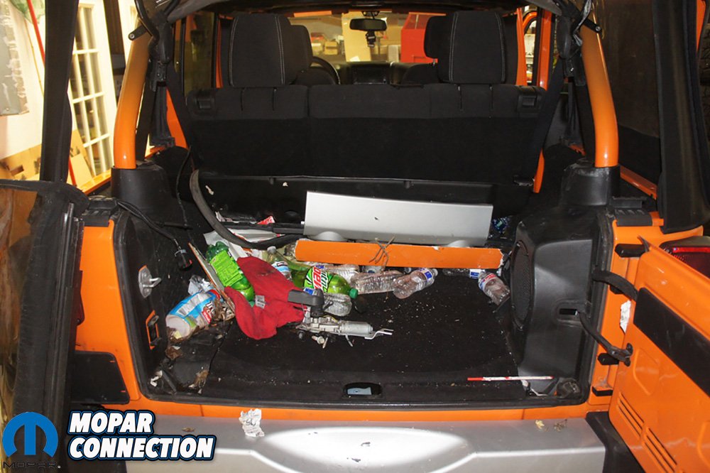 Above Left: The back of the Jeep was a dumpster. The good news is we found a few parts, bolts and clips that we needed. Above Right: Make sure to wear some sort of rubber or latex gloves when cleaning out. You never know what the previous owner left behind.