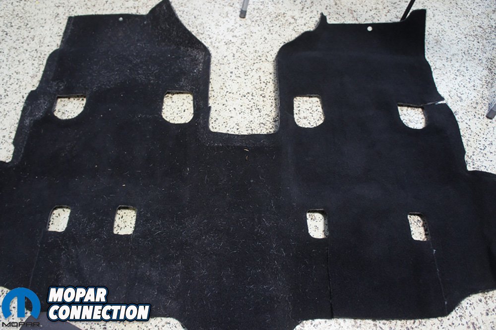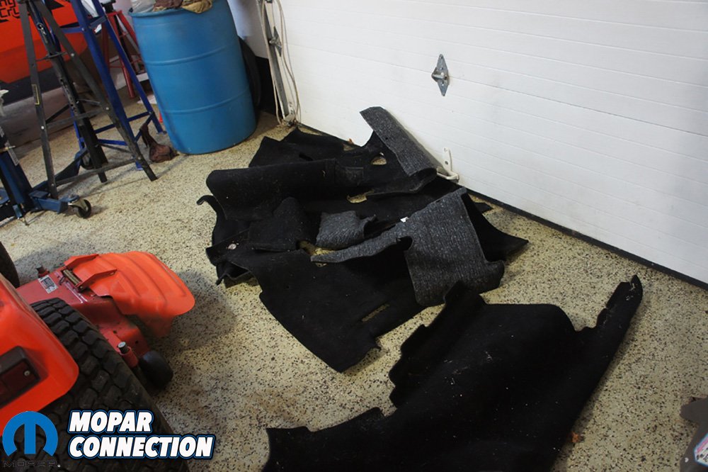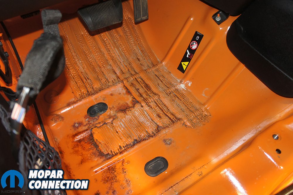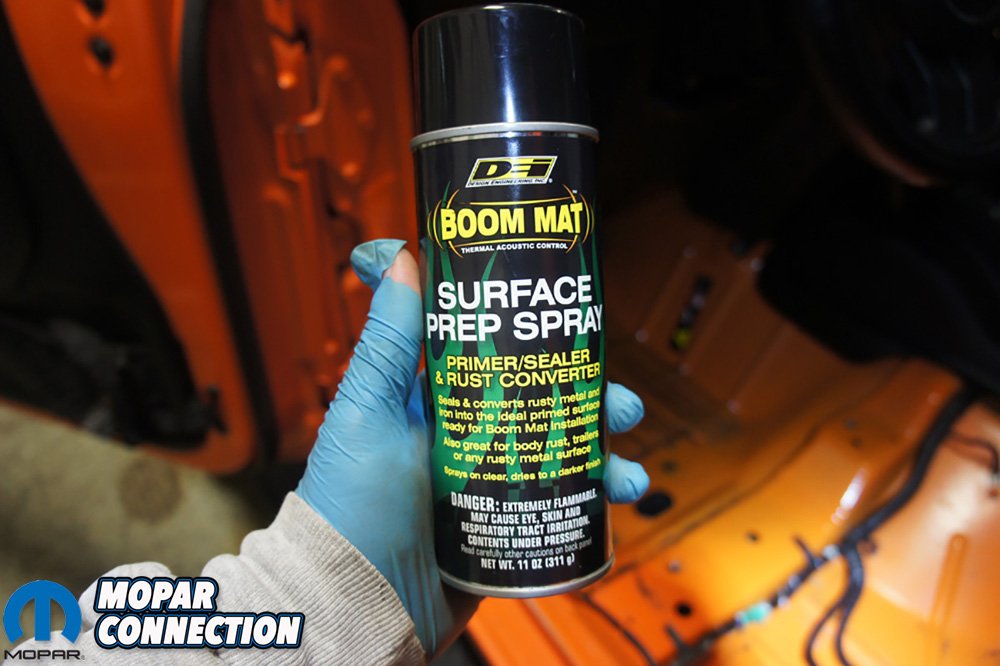 Above Left: We uncovered a little rust under the drivers carpet and wanted to address the issue now. Above Right: We used DEI Boom Mat Surface Prep to help seal and convert our rust so it would not spread any more.
