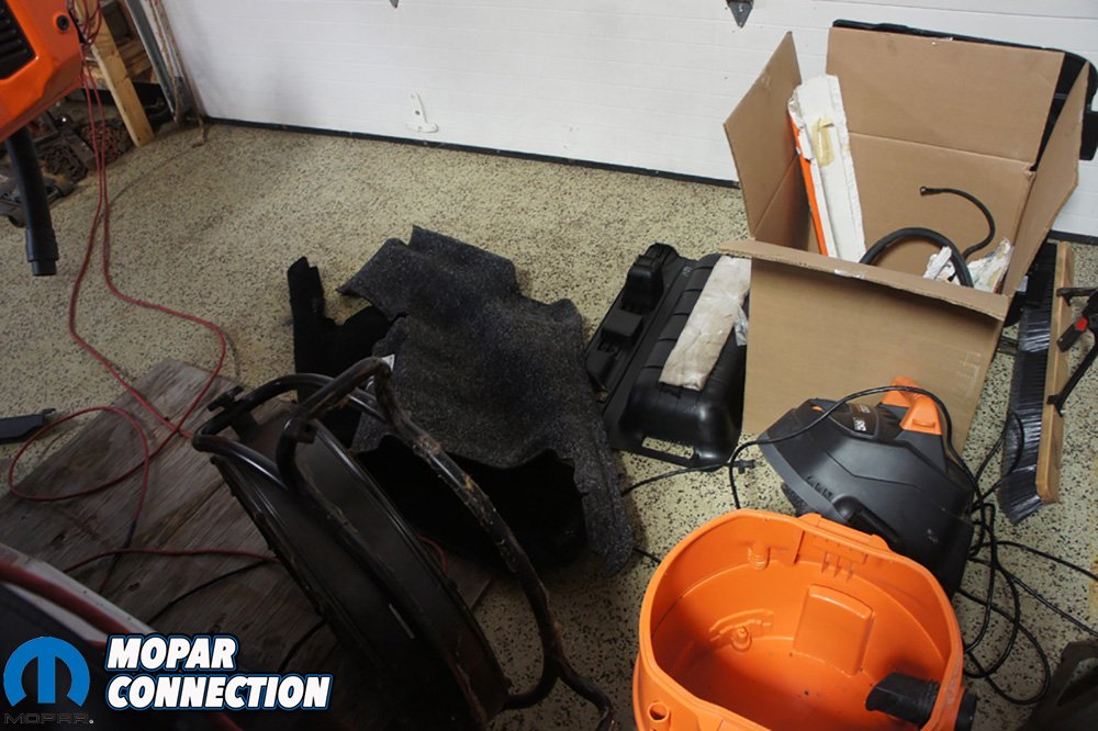 Above Left: With the big items removed we started sweeping the carpet with our shop vac. Above Center: It took us a couple of days to get our Jeep cleaned out. Above Right: You can see our parts box and pile of parts we removed from the Jeep.