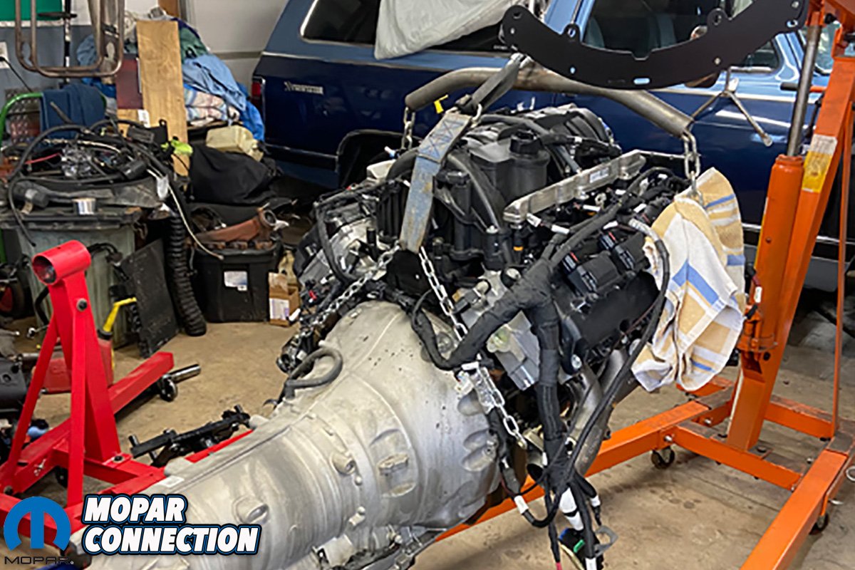 Once the old engine and transmission was removed, the swap could officially begin. Wes started by picking up a pair of Bouchillon Performance Gen III Hemi swap truck motor mounts. He then got the 5.7L Hemi and 8 speed transmission in the truck.