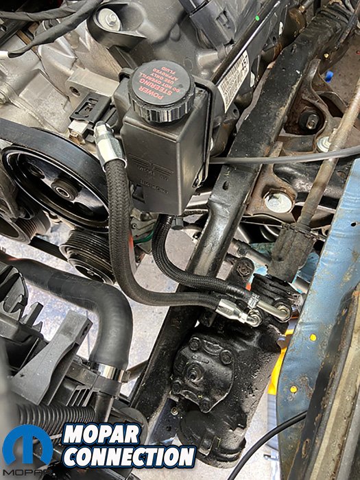The Hemi came from a Challenger that was equipped with electric power steering. After some research and small spacer, a 1999 Jeep Wrangler power steering pump was the answer. He used a remote reservoir and plumbed into the stock Ramcharger steering box.