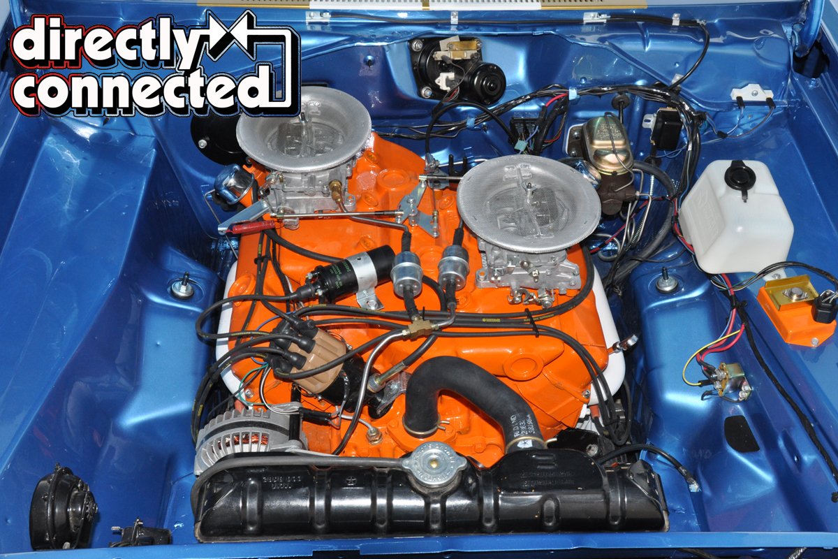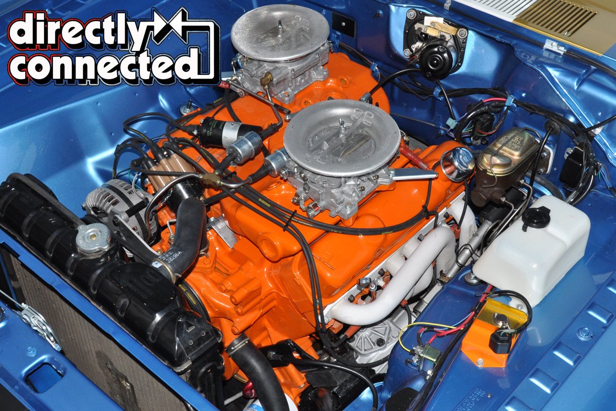 Above: 1971 440 cylinder block runs 12.5:1 compression pistons, a .590” lift Crane Cam is complemented by a mechanical valvetrain. Up top, NOS 1964 Max Wedge cylinder heads, factory cross ram intake and Carter AFB four barrels are just what Hoover spec’d, along with the carburetor flame arrestors.