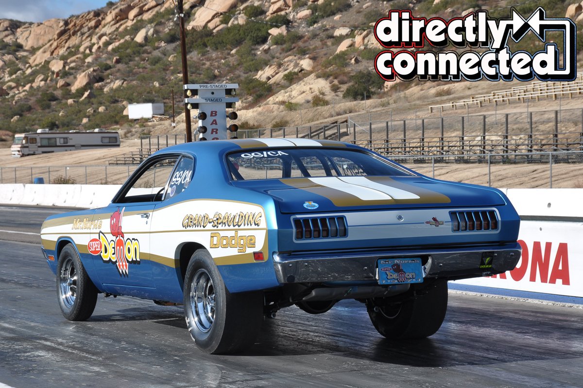 When the Demon was completed, it was shipped to Southern California where it had a date with destiny at the Barona Dragstrip in San Diego. The photos seen in this story were shot at the track, under a bright sunny sky. The track was rented just for the photo shoot, so we had plenty of time for lots of burnouts and action shots with the 440 Demon Super Stock. The Demon looked and sounded right at home in its natural environment, on the high traction asphalt. Jim Rhinehart handled the driving chores for the day, and did a great job.