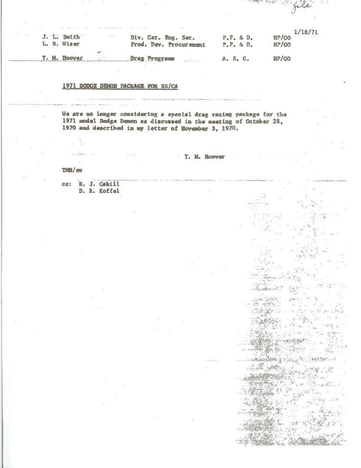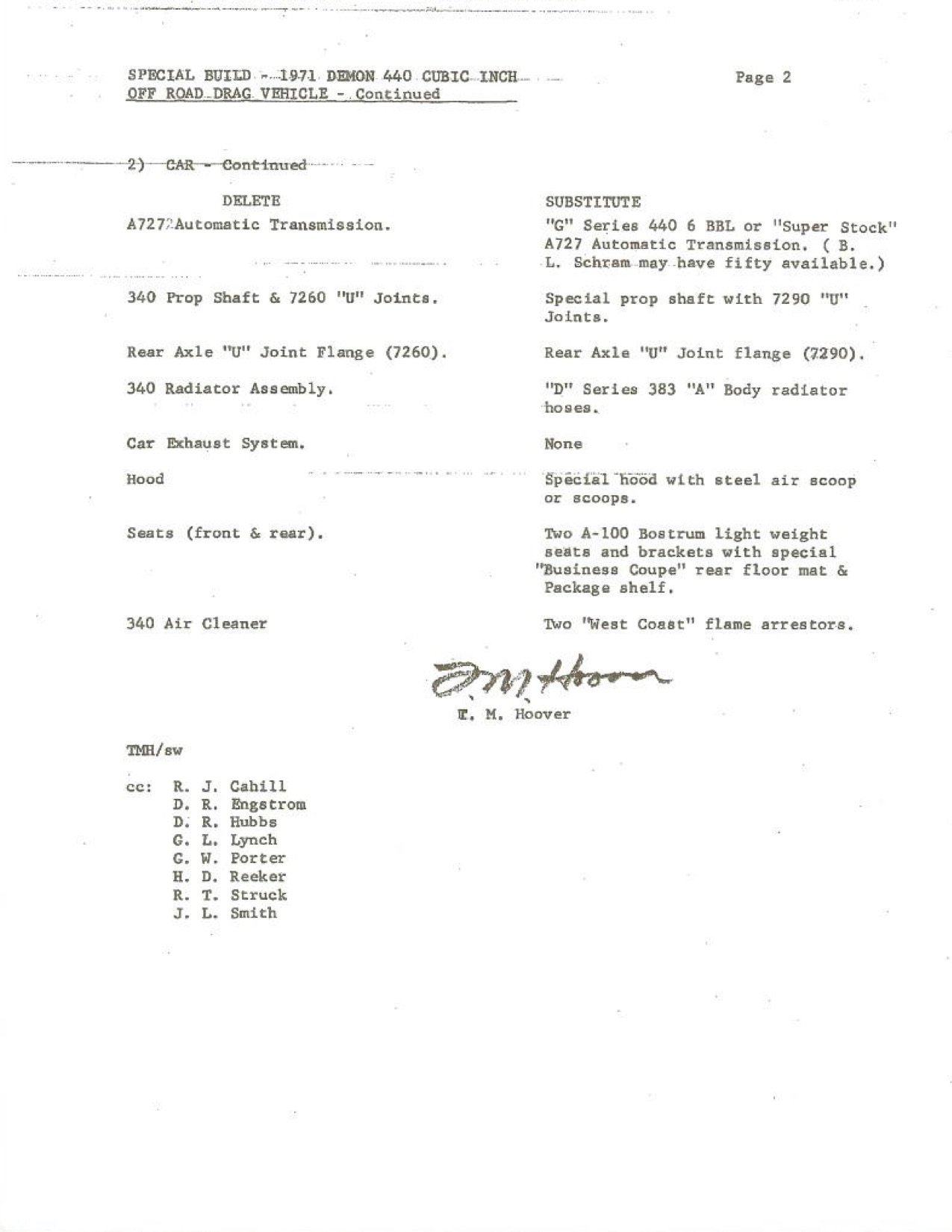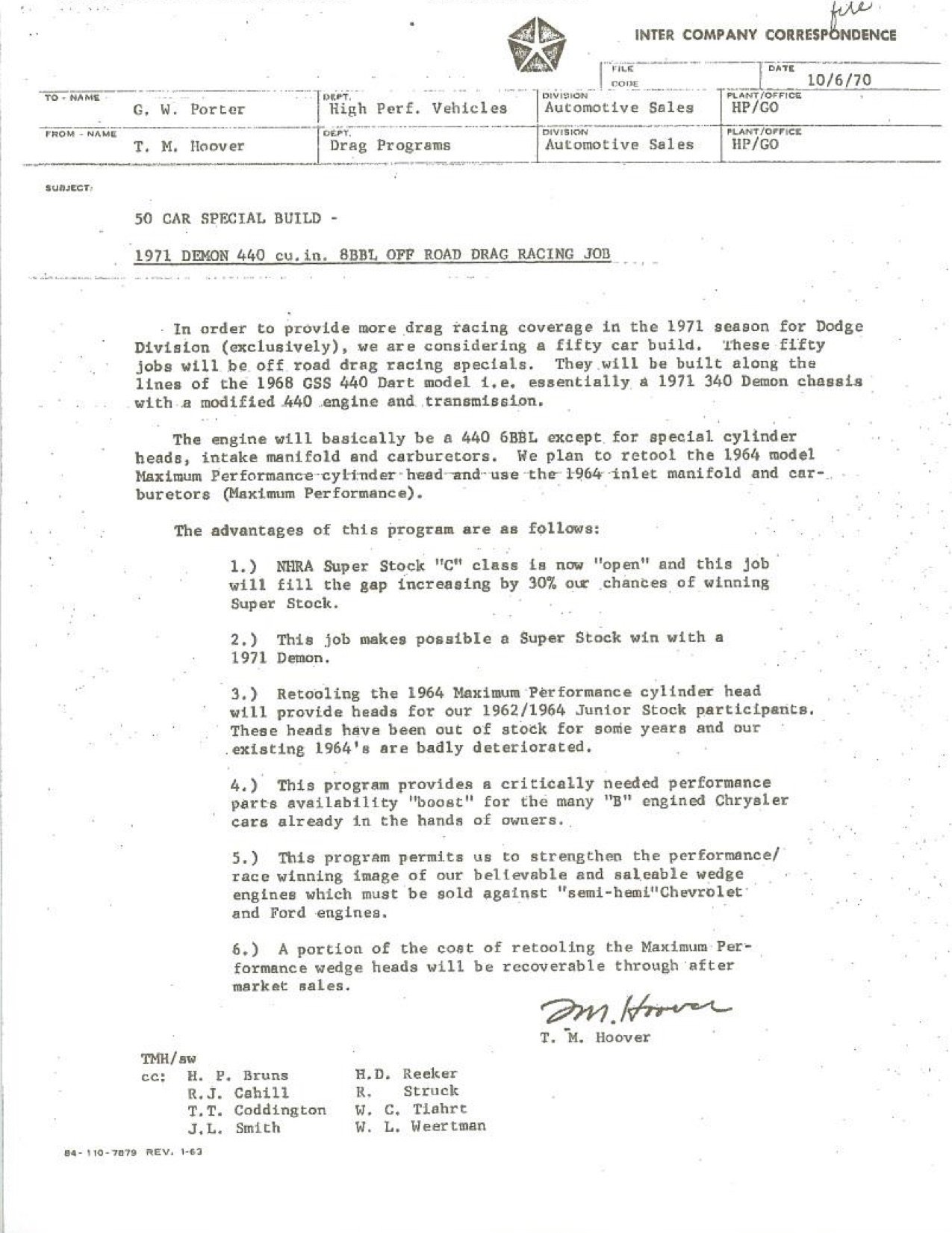 In 2010, documents were unearthed in a long forgotten file cabinet at Mopar Performance that had not seen the light of day in over 40 years. The documents were prepared by Tom Hoover on October 6, 1970, who at that time was in the Drag Program Department at Chrysler. They contained information about a proposed vehicle program that would have had a significant impact on NHRA Super Stock racing. The result would have been even further domination by Dodge in this important segment.