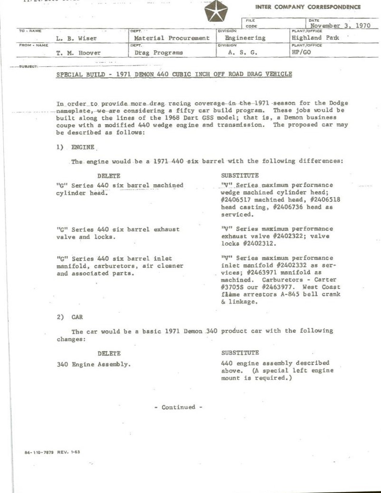 Above: These are the original documents that Tom Hoover drafted outlining the 440 Demon Super Stock Program in October, 1970. The goal was for the 440 Demons to dominate SS/C just as the Hemi Darts were doing in SS/B. Not only would this have resulted in Chrysler dominance in the top Super Stock classes, it would also increase the chances of winning Super Stock Eliminator by 30 percent according to Hoover.
