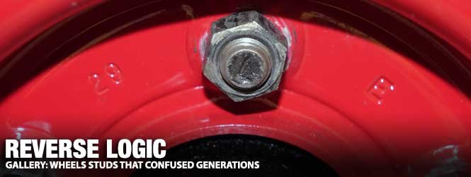 Above Left: Many unsuspecting weekend warriors and seasoned mechanics were caught by the dreaded left-hand threads. The result was broken wheel studs. (photographer unknown) Above Right: The technology of the day, which included lug nuts with no or minimal taper, thinner steel wheel construction, and soft lug studs, resulted in the right-hand threads on the driver’s side having a chance of loosening when the vehicle traveled down the road. The left-hand threads were introduced on the driver’s side of Mopars in the 1930s to eliminate the odds of the nuts loosening.