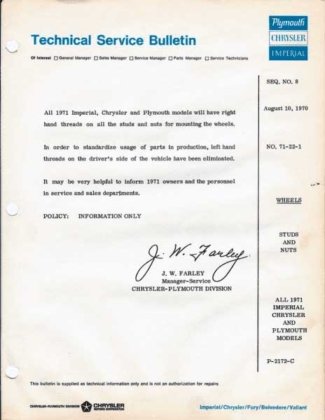 The end of the left-hand-threaded wheel-stud era came quietly but decisively. The technique was phased out during the 1970-71 model year for passenger cars, and by 1972 Chrysler had fully adopted right-hand threads at all four corners (with rare exceptions). A few heavy-duty trucks and specialized fleet vehicles carried the design slightly longer, but for consumer cars, the era was over.