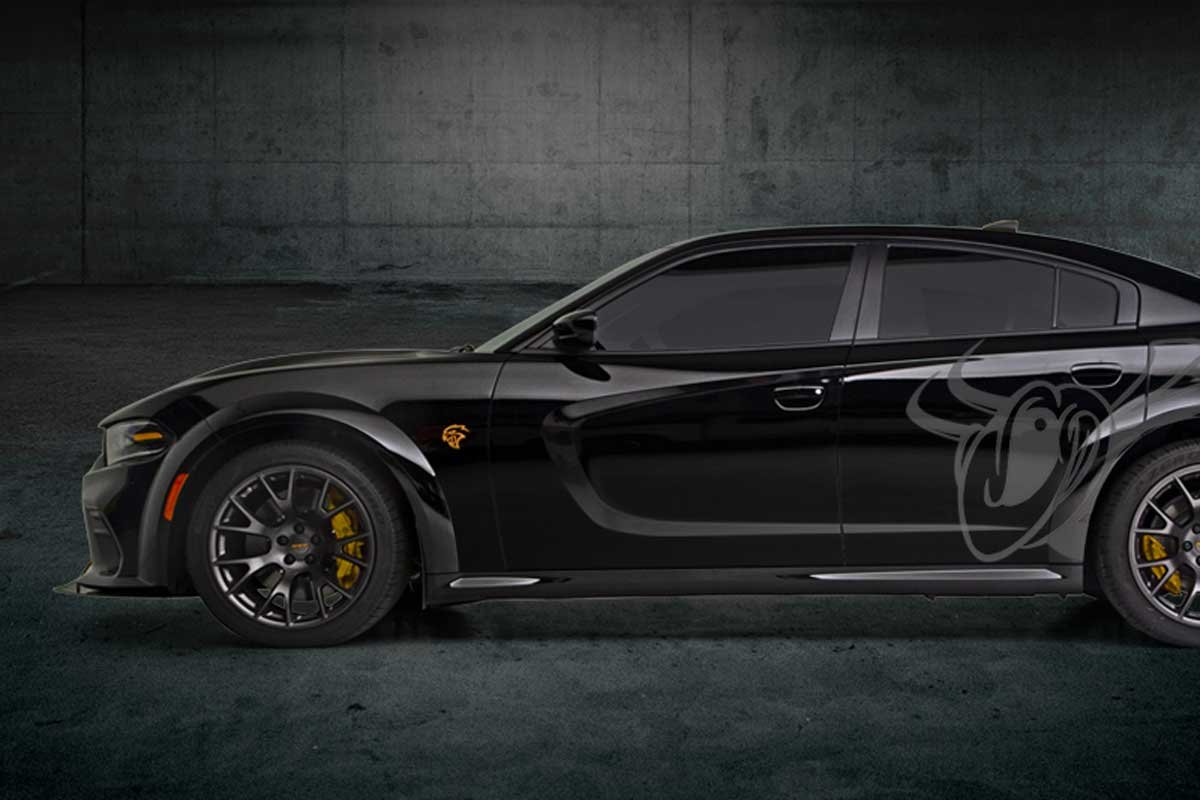 The ’23 Charger Hellcat Hell Bee is one of none. The exterior is Pitch Black paint with a Laguna leather interior. In addition, the following components have been upgraded to enhance the performance and appearance. The brake calipers, exhaust tips, exterior badging, and SRT spoiler are all finished in black. Additionally, the seat belts and floor mat binding are finished in sepia (a reddish-brown color). Lastly, the rolling stock consists of 20×11-inch carbon black Warp Speed Wheels and 305/35ZR20 3-season tires.