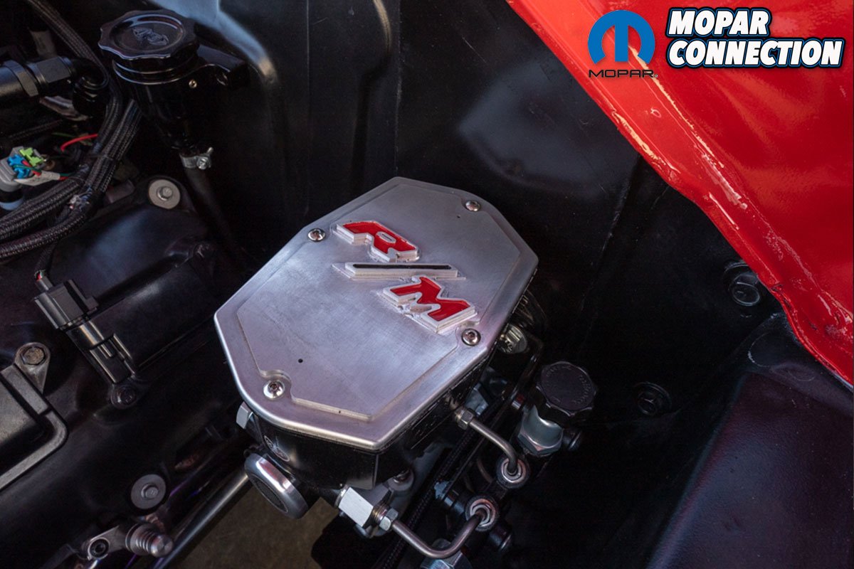 Under the hood, the Charger is anything but vintage. The entire engine bay including the firewall has been shaved for a smooth and clean finish and Ring Bros billet hood hinges were installed. Between the fenders sits a Gen III 426 cubic-inch crate Hemi producing 650 horsepower from Blueprint Engines. Built off a new Hellcat Hemi engine block, Blueprint installs the best of the best when it comes to parts to build the perfect combination of performance and reliability.