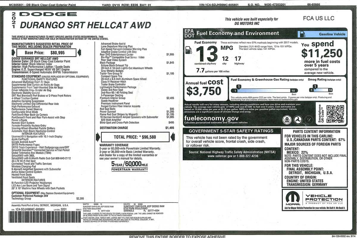 Above: Check out the window stickers for each Hellcat. The list of standard and optional parts installed is impressive. Unfortunately, the fuel economy is a little low, and although these cars could be daily drivers, they will likely be used as weekend warriors.