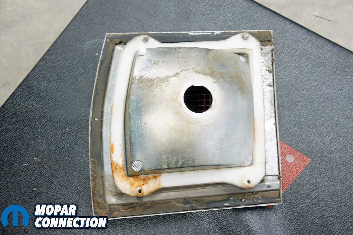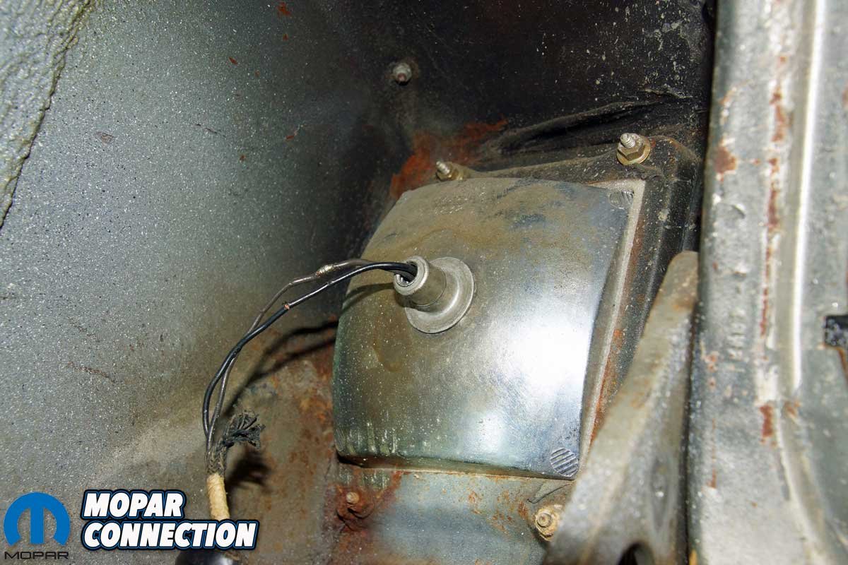 Top Left: The 1967 Dart has only a single bulb connector. Four nuts secure the housing. Top Right: The connector popped out of the housing. Bottom Left: The passenger’s side assembly remained seized in place with the four nuts removed. We needed a mallet to persuade the housing. Above Right: Once loosened, the assembly slipped out of the Dart.