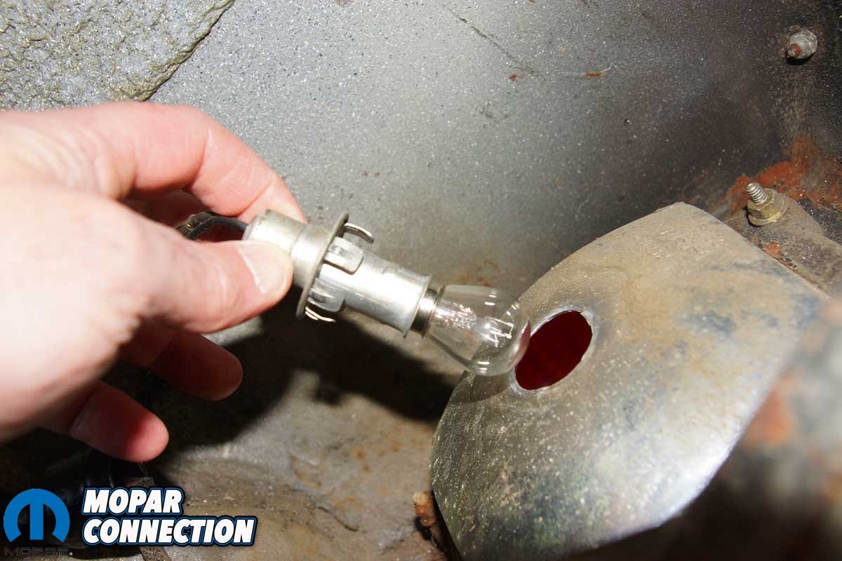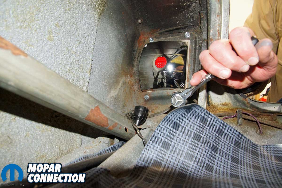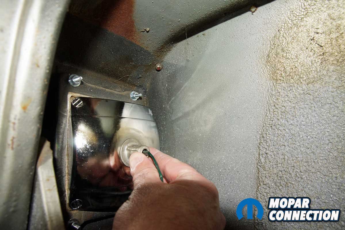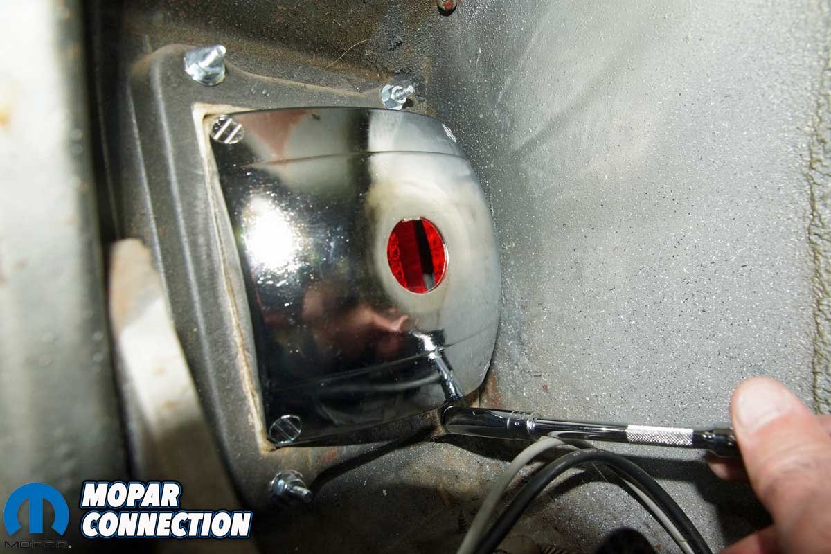 The ’67 Darts have only the brake/park/blinker light clipped to the housing. So, to begin the disassembly, we started by popping the light connector from the taillight housing. Then, we reached deep into the trunk’s back corner of the quarter panel to remove four 3/8-inch nuts from the passenger side housing.