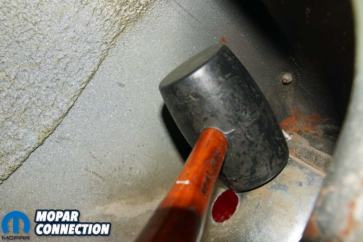 Even with the four nuts removed, we could not free the housing from the rear of the Dart. With the passing of 55 years since its installation, the housing had seized to the quarter panel. We loosely threaded a nut back onto one of the studs, and then we tapped on the housing with a mallet.