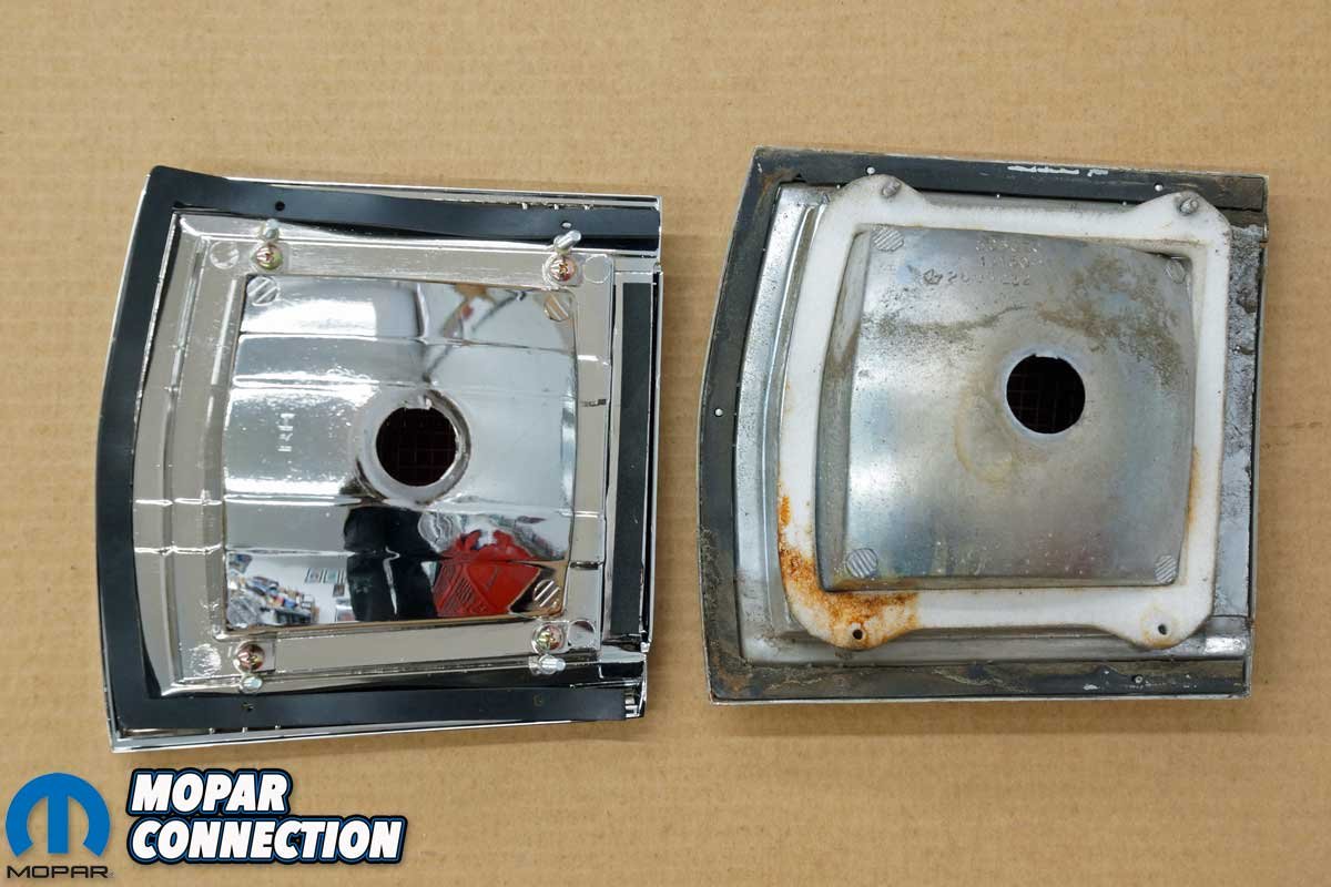 Top Left: Once the housing was out of the Dart, we found a small area of rust. Top Right: The area was cleaned and painted before installing the Year One taillight. Bottom Right: It appeared the passenger’s side factory housing had not been removed since its installation in 1967. Bottom Right: The Year One taillight (left) and the factory taillight appear identical. However, the Year One assembly has an additional seal strip.