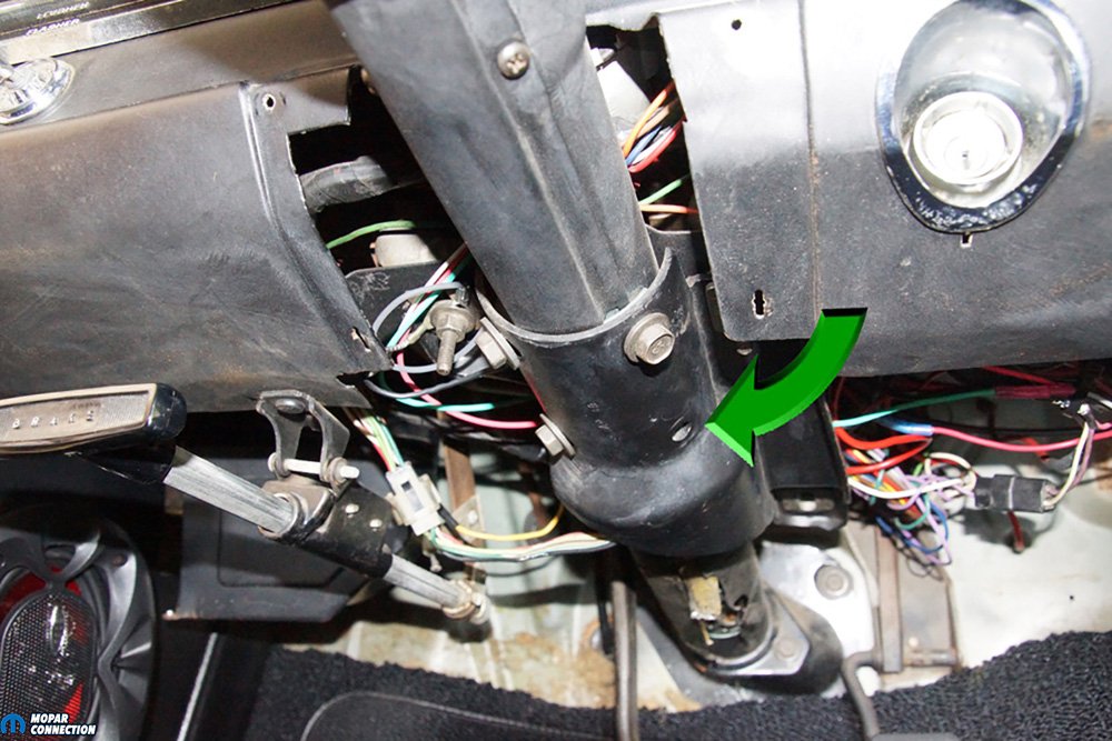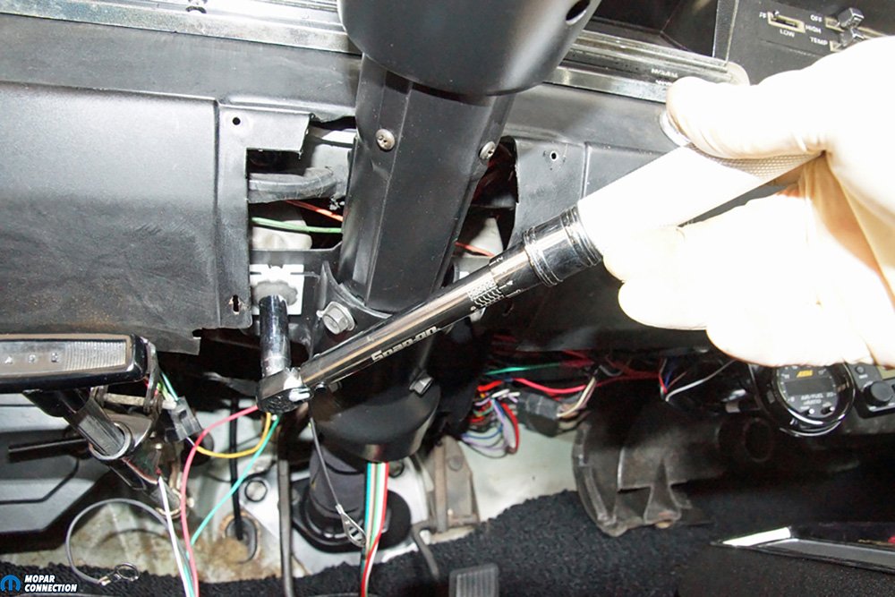 To slip the column back into the Dart, we guided the coupler onto the splined steering box shaft and tapped the roll pin into place. The breakaway bracket capsules slipped over two studs extending from the dash. New washers and nuts fastened the column in place. The steering column coupling clamp was maneuvered over the column shaft and secured into the coupler roll pin.