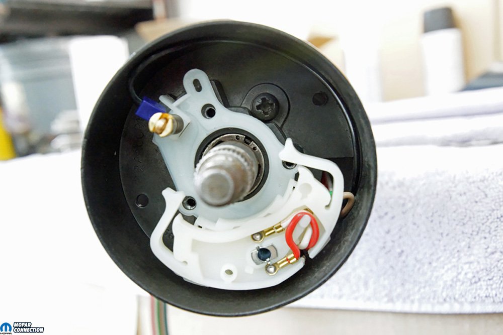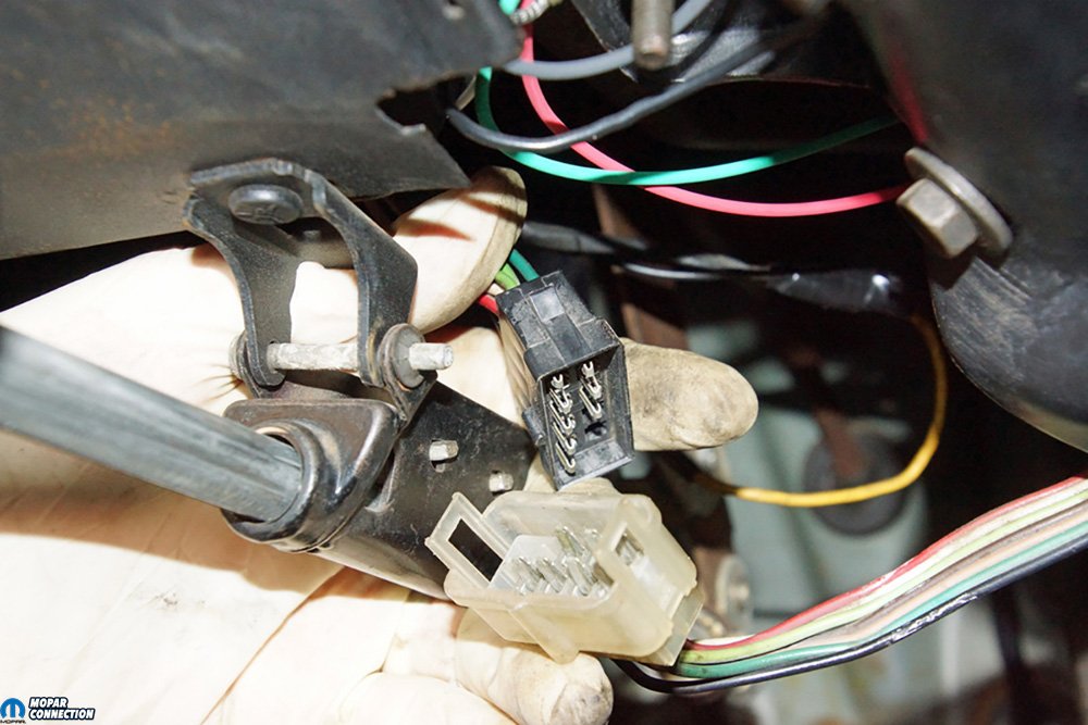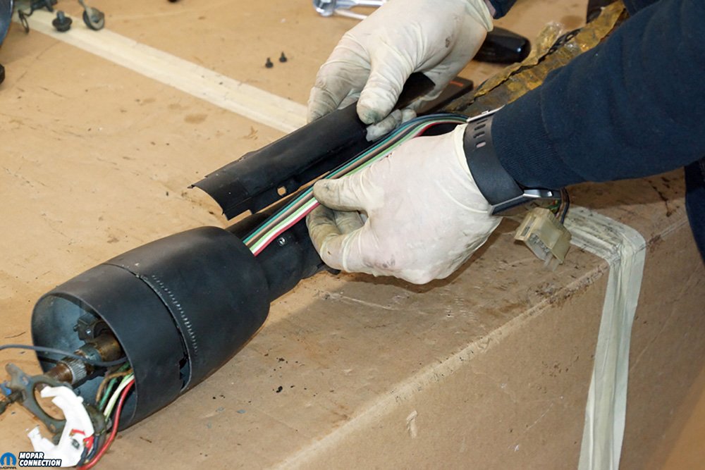 Above Left: The under-dash blinker switch wiring was disconnected from the Dart’s main harness. We did not notice any wire damage, but something was undoubtedly operating incorrectly because the blinkers operated sporadically. Above Right: The steering wheel horn button and horn ring had to be removed so we could gain access to the nut holding the steering wheel onto the column. We carefully maneuvered the horn wire through the horn ring.