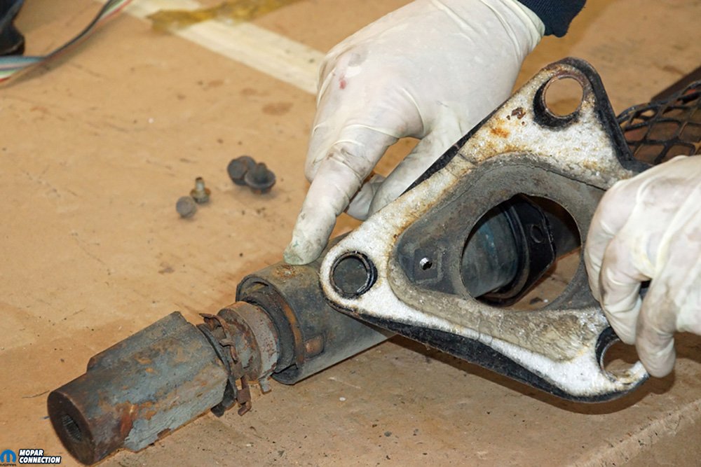 Above Left: The coupler on our Dart had a seal and cover that were in terrible condition. It does not look like the seal has been performing its job in years. Above Left: Further investigation found another bolt that held the breakaway bracket to the column jacket was missing. Whoever serviced the column did a poor job.