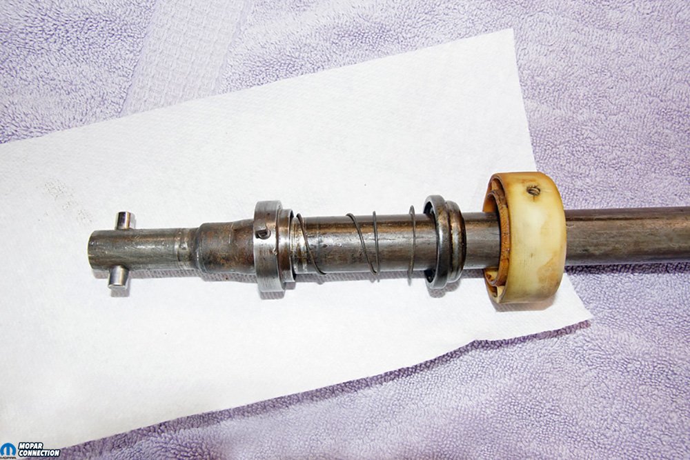 Above Left: The assembly began by slipping the collar lock, spring, washer, bearing, and the plastic column shaft support onto the column shaft. Because the cross pin was in good shape, we decided to reuse it rather than press it out and press a new one in. Above Right: After the snap ring was installed, we moved back to the other end of the shaft. With the bearing packed with #2-wheel bearing grease, we pushed the bearing into the plastic support. The spring was compressed between the bearing washer and the collar. With the collar sufficiently compressing the spring, we tightened the collar lock screw.
