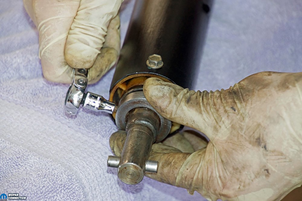 The clamp safeguarded the coupler cover and seal from loosening and allowing contamination of the coupler’s grease. To finish the rebuild, we situated and tightened the column plate to the firewall, adequately shimmed the last breakaway bracket capsule, and reinstalled the steering wheel onto the column.