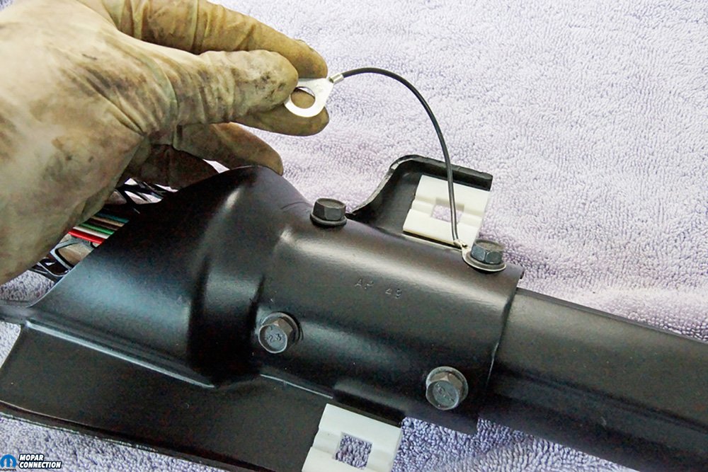 Above Left: Our column had a portion of a paper cover over the mesh area when we removed the column. We simulated the look with a piece of construction paper and some electrical tape cut into strips. The look was similar to the factory, and it does reduce the amount of debris that can get into the column jacket. Above Right: We rechecked the 1 ¼-inch gap between the coupler cover and the collar lock. It was within specifications, so we torqued the new YearOne washers and nuts to the two forward capsules. The horn ground was secured to the left stud (where the socket is) with an additional nut.