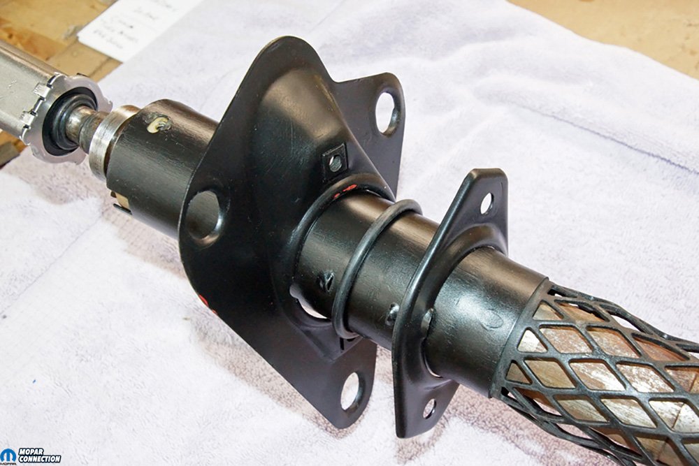 The column reassembly started by sliding the collar, spring, washer, lower bearing, and plastic support onto the column shaft. The YearOne 1967-72 A-body steering column mounting kit provided us with all the mounting hardware and seals for the column. The kit also had plastic capsules for the breakaway bracket, which we installed onto the bracket in place of the original aluminum capsules.
