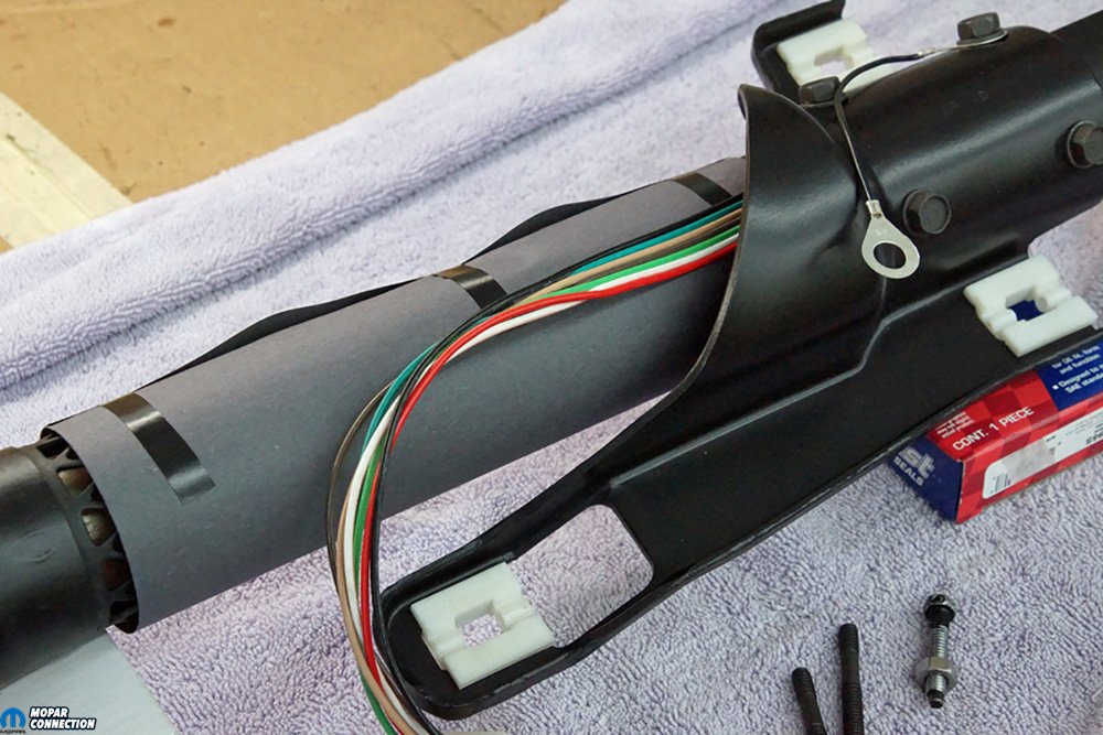 To finish the column, we slipped the seal plate, the new O-ring, and column plate onto the column jacket after temporarily removing the plastic shaft support screws. We secured the seal plate to the column plate with new bolts, glued a seal onto the column plate, and reinstalled the shaft support screws. The O-ring, bolts, and seal were all part of the YearOne hardware kit. As a final touch, we fabricated a piece of black construction paper (similar to the factory) to cover the column jacket mesh area.
