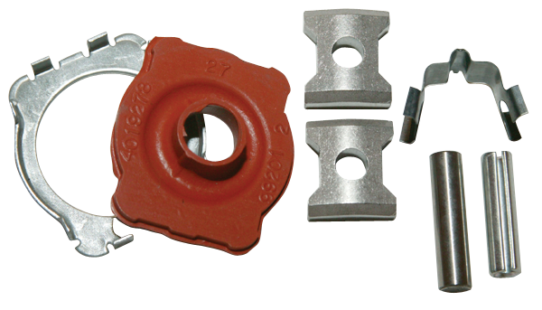 Above Left: The new cover and seal were installed onto the column shaft. We slipped the shoe spring onto the cross pin. A shoe was pushed onto each side of the cross pin and into the shoe spring. We put a thin film of grease on the cross pin and the shoes. Above Right: To crimp the cover onto the coupler, we lined up the seal and the cover with the coupler. A pair of C-clamps retained the cover while we used channel lock and pipe wrench pliers to bend the cover’s tabs onto the coupler housing.