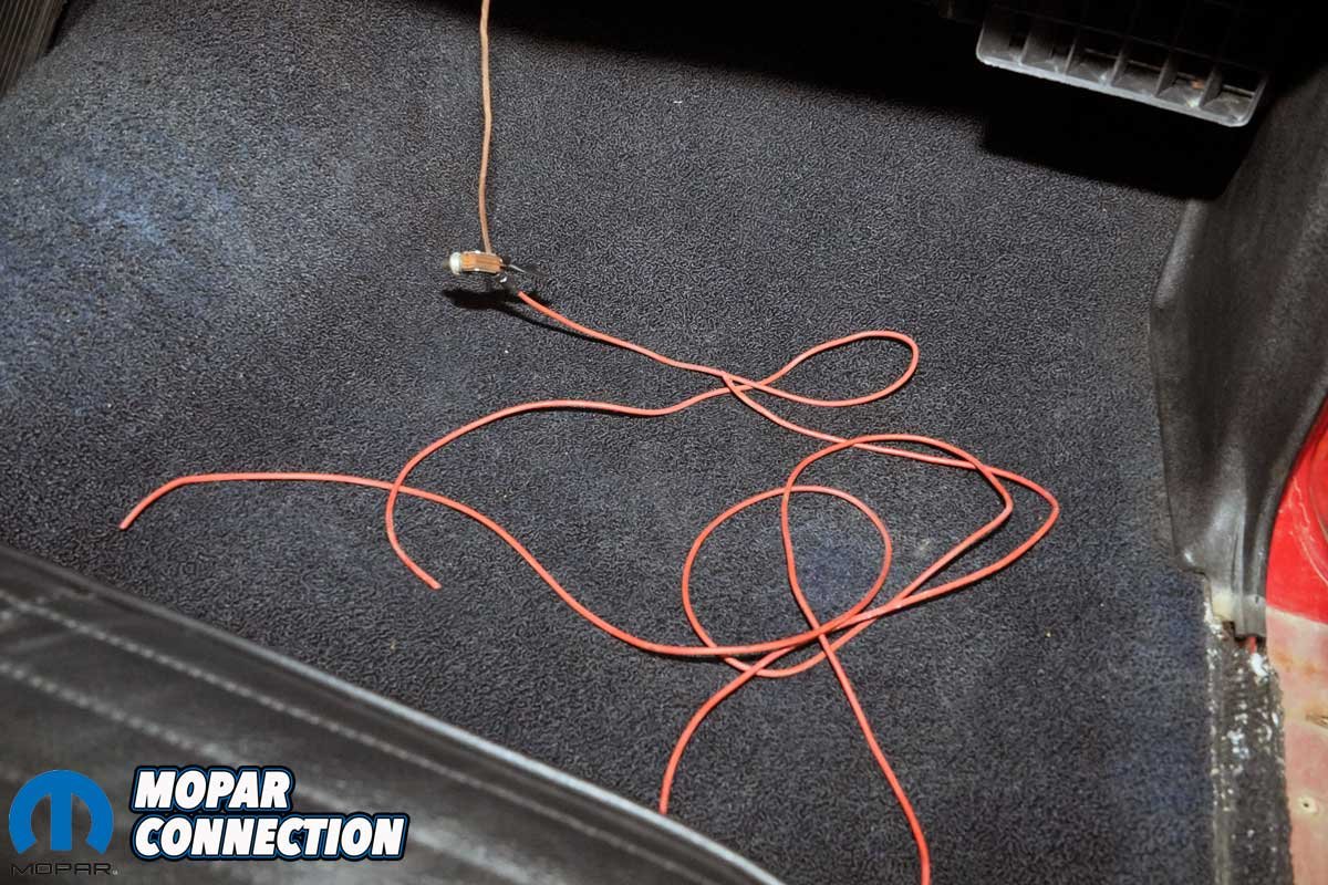 We traced the 12-volt wire to a toggle switch under the dash (attached through the glovebox) and then to the fuse box under the glovebox. After removing the passenger-side rocker panel trim, we drew the wiring from the trunk into the interior of the Runner. Once we pulled the wire from the fuse box, we fished it through the kick panel. The wire and switch were discarded.