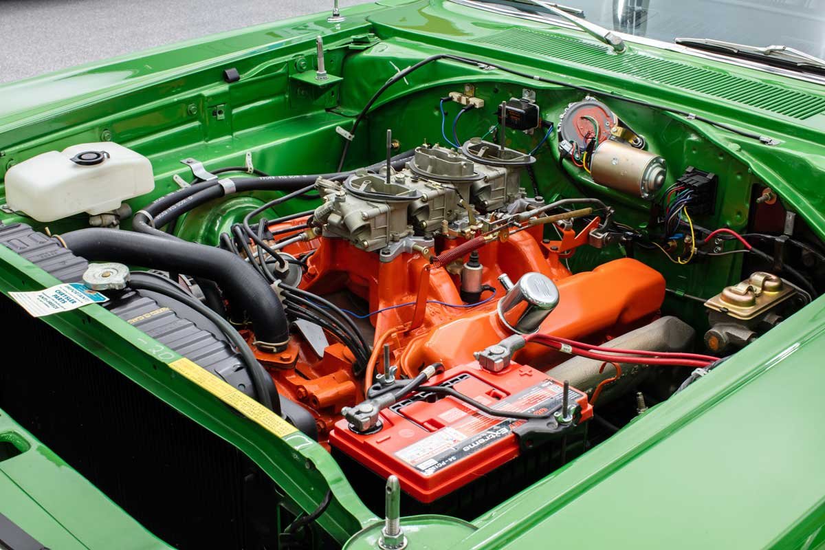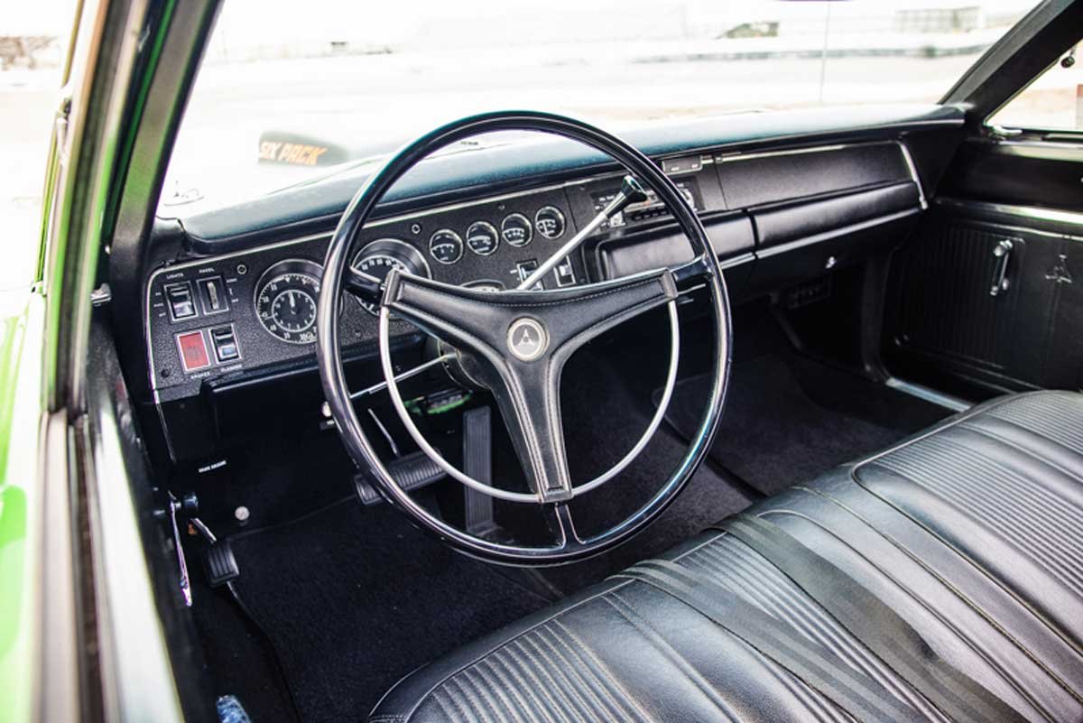The exterior of the Super Bee is finished in a beautiful factory color, F6 Bright Green. A white bumblebee stripe wraps the rear of the car and provides an eye-appealing contrast to the green.