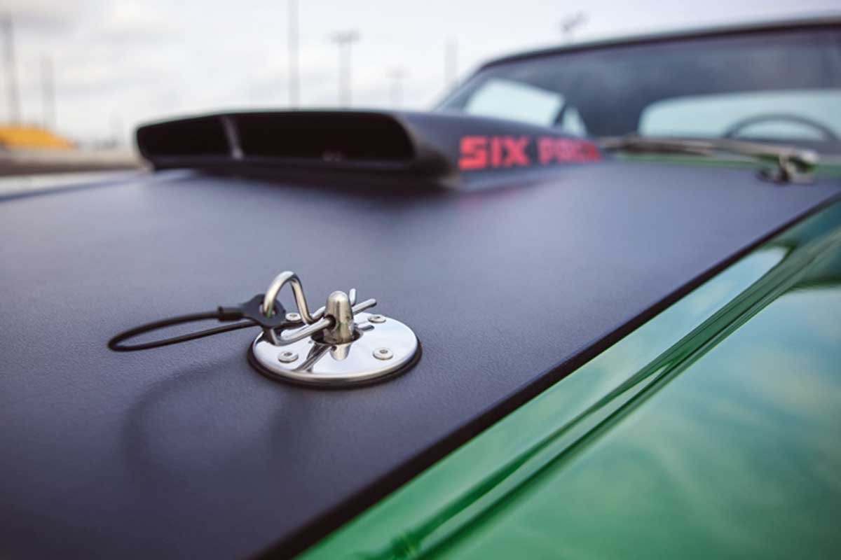 The Super Bee, a mid-year option on the Coronet, came stock with a 390 horsepower 440 breathing through three Holley two-barrel carburetors. The “Six Pack” carb setup was fitted underneath a menacing flat-black lift-off hood tethered to the body with only four hood pins. On the hood was an expansive and lofty hood scoop with Six Pack lettering displayed on either side of the scoop.
