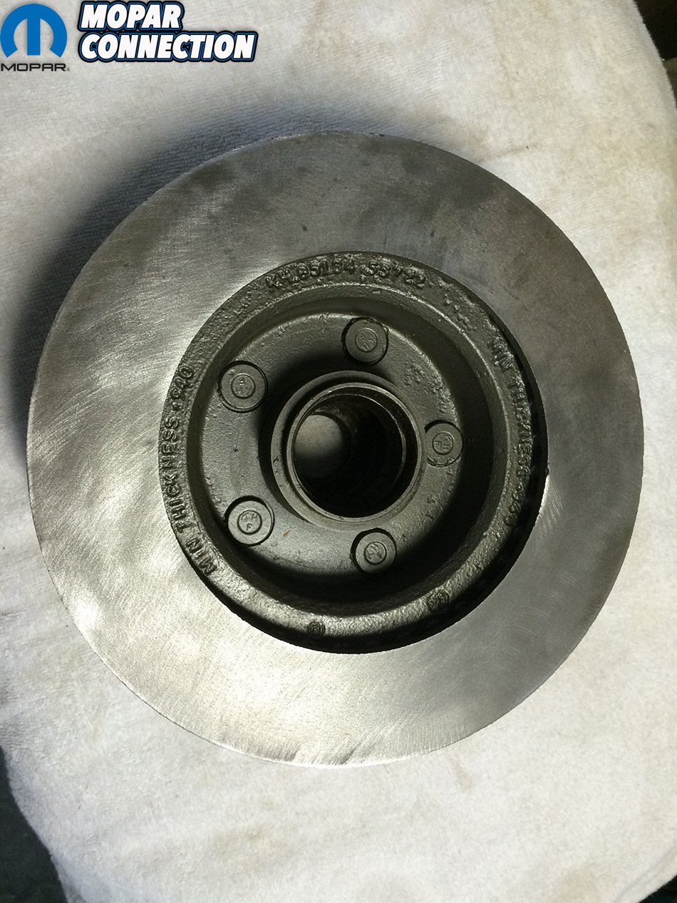 Above left: After carefully blasting the rotor without blasting the surface where the pads contact the rotor you can paint it with a dark cast color. Then take the rotor to have it turned. Then take some fine Emory cloth and sand them with a circular motion. This make a really good surface for seating the pads during the early miles of operation. Above center: Even though there is a slight chip in the surface of the center of the hub this original rotor is worth using. Replacements are not identical to the original but can be used if yours are too far gone to save. Above right: This shows all of the original details of the brake rotor. The notch, the two piece wheel stud plate, and the balancing weights. By painting this rotor before it was turned it is ready to re-assemble.