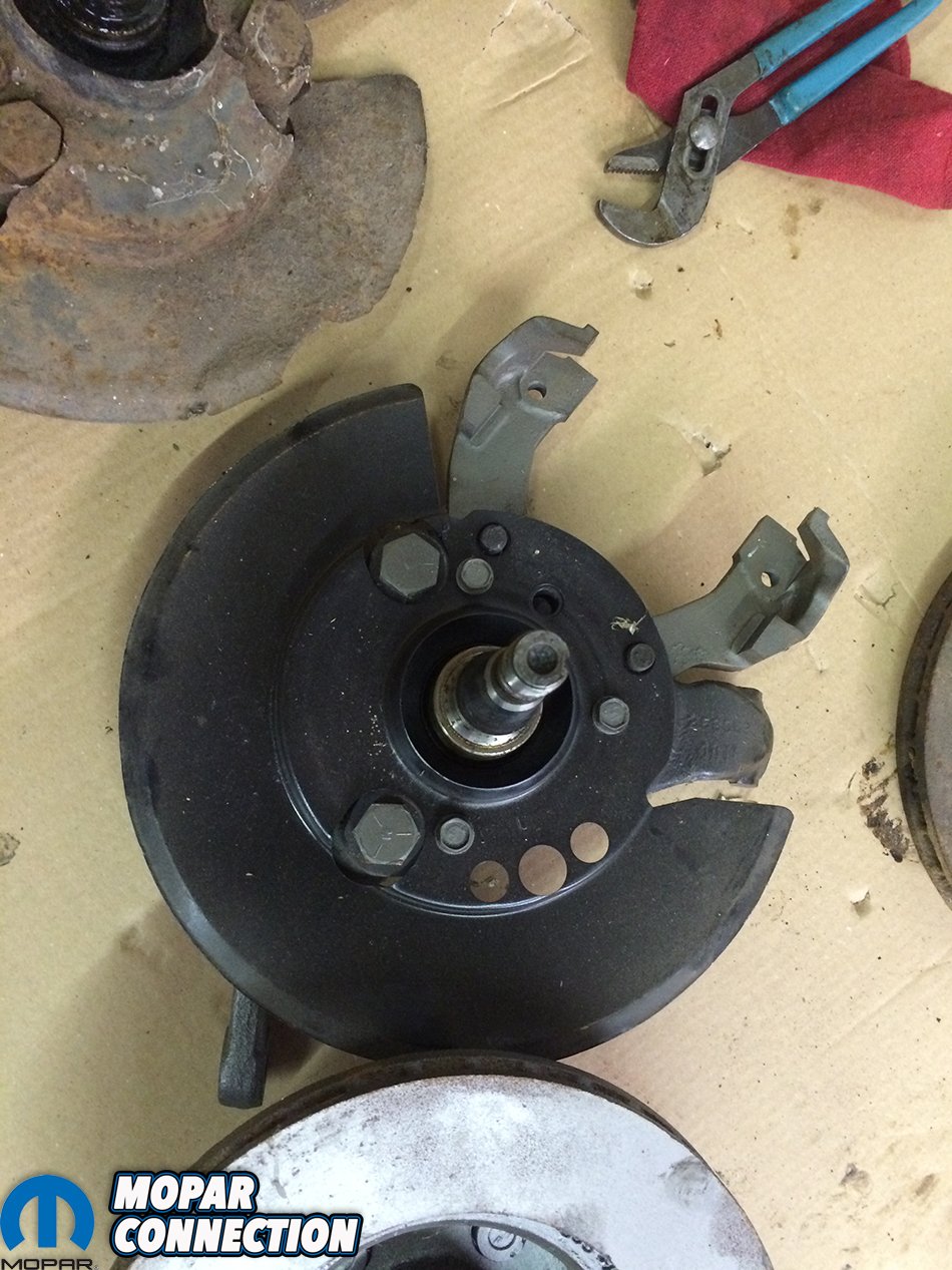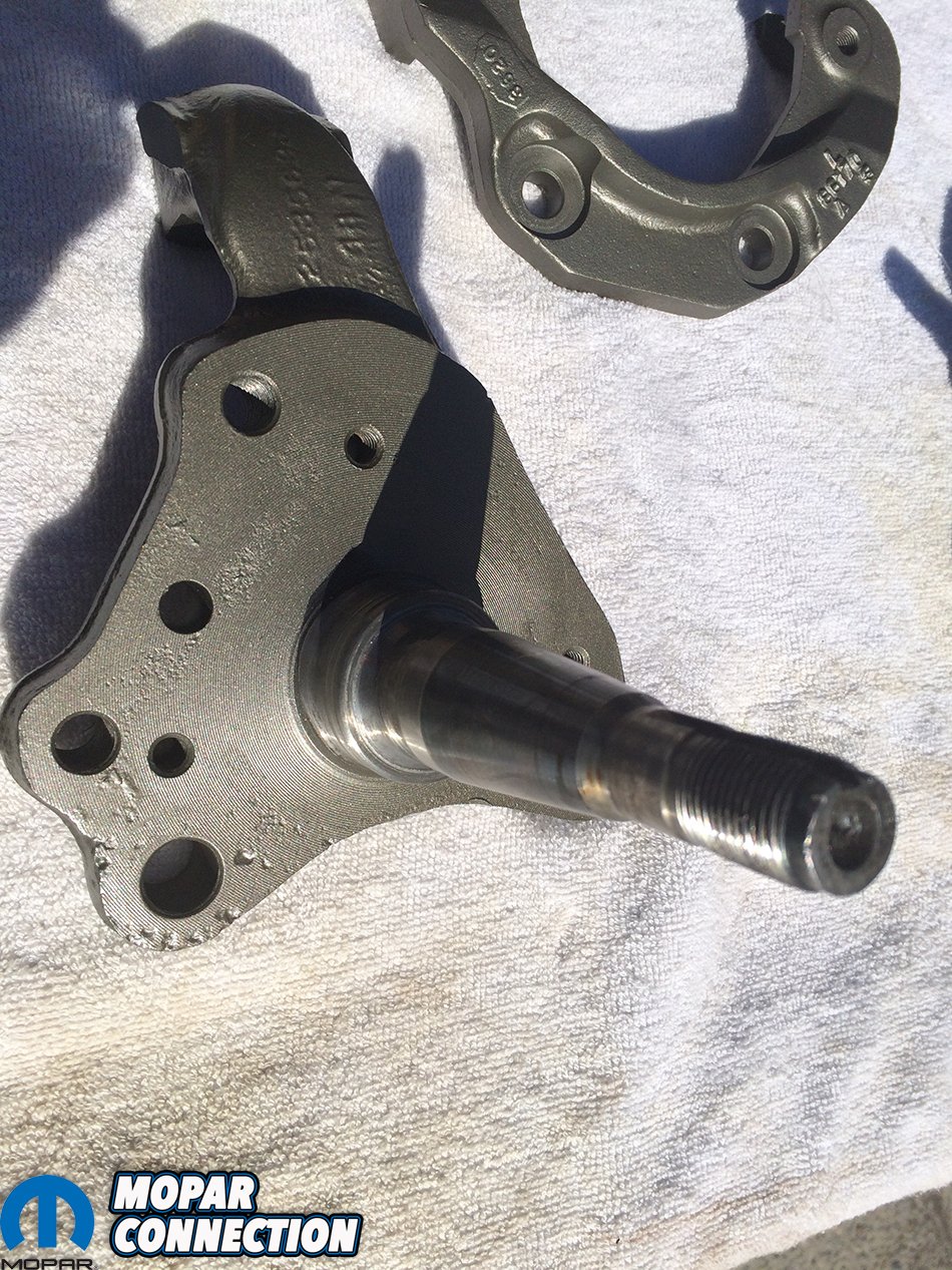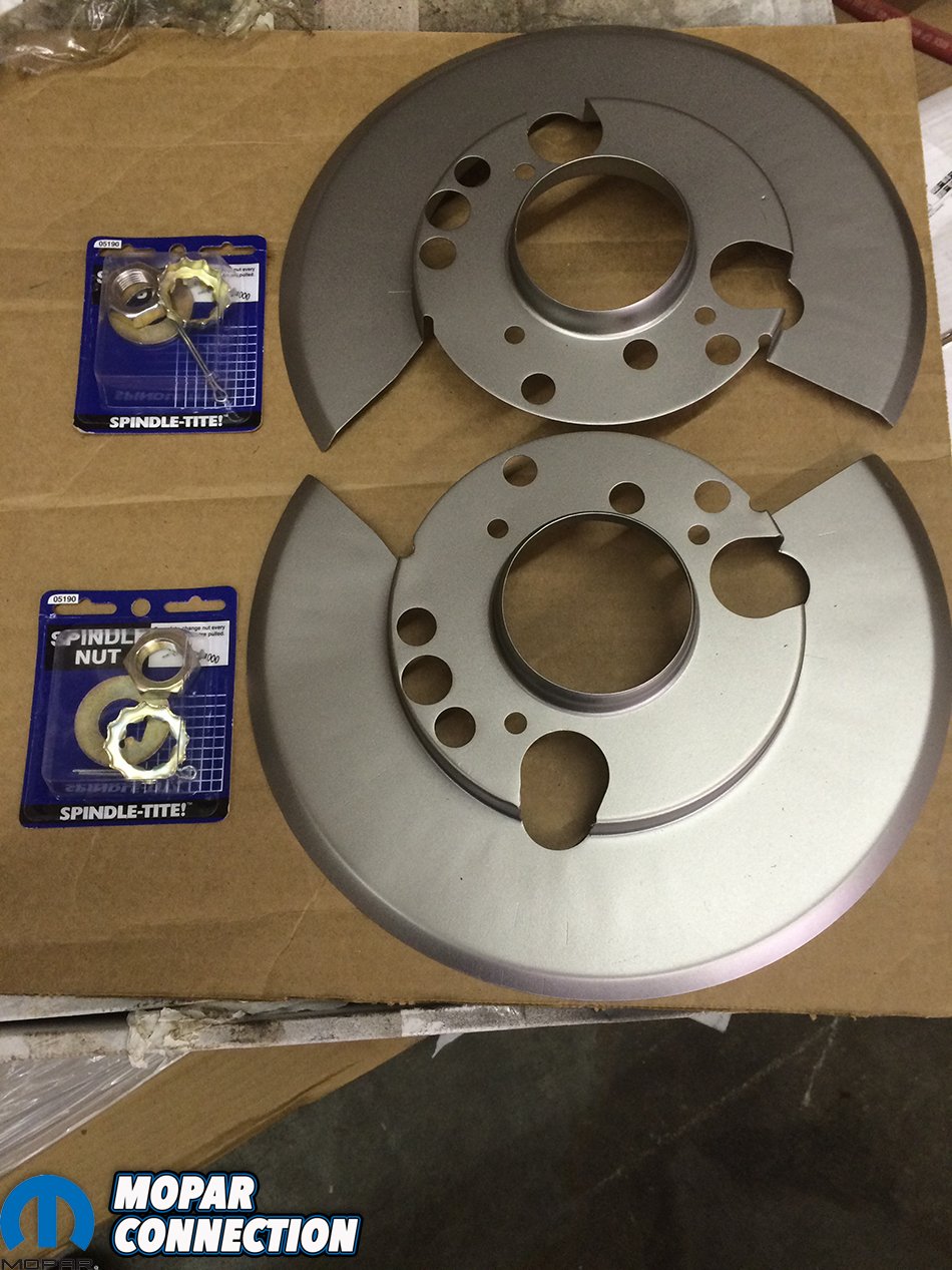 Above left: All pieces have been blasted, turned, and new lower ball joint will replace the worn out original. Moog parts are as close as you can get to original unless you find NOS ones. Above center: The original spindles were in good enough condition to save. Do not blast or paint the surface of the spindle where the bearings and rotor ride. Notice the original part numbers on the spindle and the date codes on both the spindle and the caliper mounting bracket. Above right: First step in re assembly is the dust shield. It has been painted semi- gloss black and the attaching bolts are black phosphate.