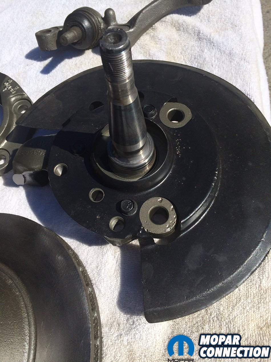 Above left: Up close shot shows additional inspection marks. It also documents the clips on the caliper bolts that are almost always missing. Also notice that the lower ball joint is held on by a six castle nut while the upper is a three castle nut. Above center: Notice the back side of the poor condition assembly that looks like it is beyond saving. It isn’t and since it has all original parts it should be saved. Above right: Someone has done some previous incorrect work on this unit. At least it is clean and complete. Obviously the bearings and seals need to be replaced. Inspect the spindle and make sure it is smooth and in usable condition.