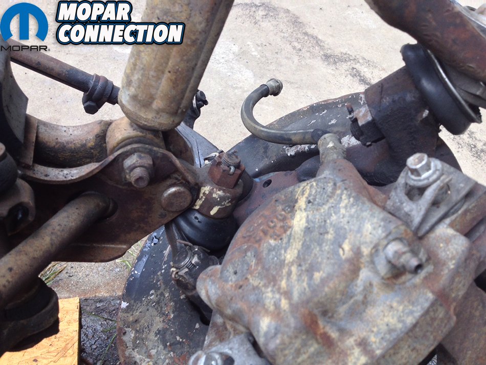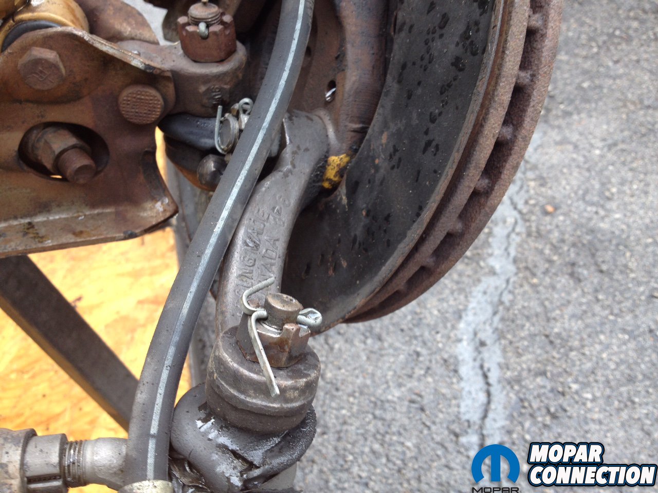 Above left: Here is an untouched original front disc brake assembly from a 1970 Plymouth. It has been steam pressure washed and care was taken to not remove the original inspection marks. Notice “orange” “blue” and “yellow” inspection marks. Don’t let the new nut and bolt that is from the stand fool you. Above center: Galvanized dust shield that has been painted black along with an original brake hose. Also notice the way the factory bent the cotter pins and the blue inspection mark. This is the left side assembly. Above right: This is the right side and the inspection mark is yellow compared to the blue one on the left side. Notice the three castle nut on the tie rod end and the cotter pin has at some time been replaced and is not original. It is way too long and not bent the way the originals were.