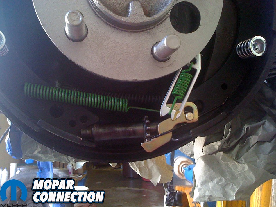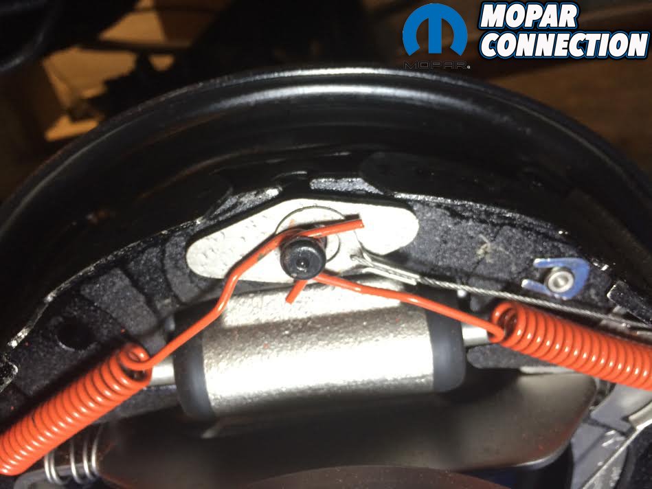 Above left: The wheel cylinder had to be replaced because the original had too many rust pits in it’s bore. Notice no original part numbers in the cylinder. Orange springs and all new hardware complete the assembly. Above center: Notice the attention to detail on this assembly. The emergency brake retainer was red on this low mile 70 road runner, so it was painted the same way it was found. When removing the cable be careful to not damage the retainer. It must have its teeth compressed so the cable can be removed from the backing plate. Above right: Completed drum brake assembly that is finished the way it came from the factory. It will now function better than new. Even though it will soon be covered by the brake drum and wheel you will have the pictures to prove you didn’t cut any corners in “Restoring” your car. Remember to “Restore” means to totally return to the way the car left the factory.