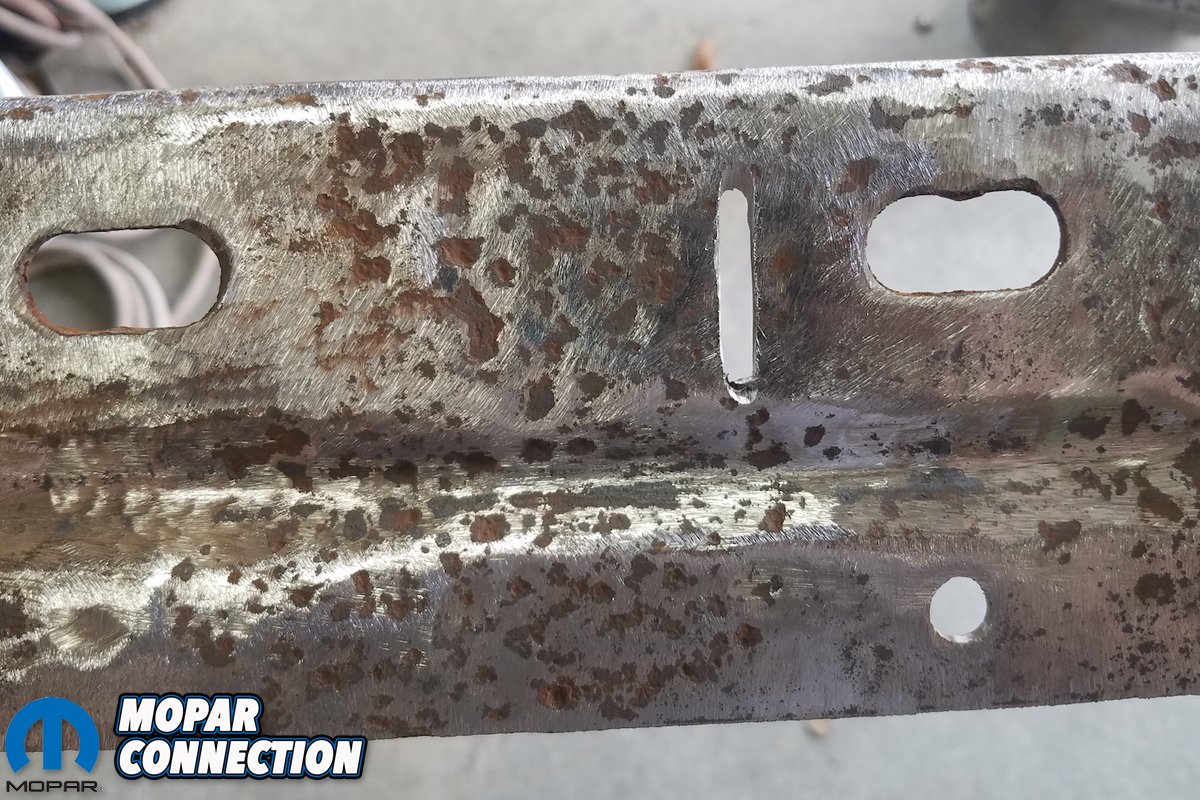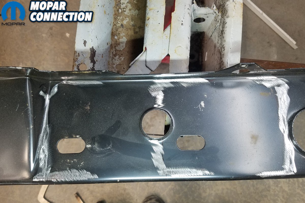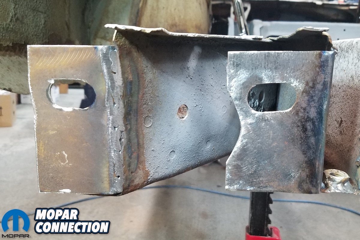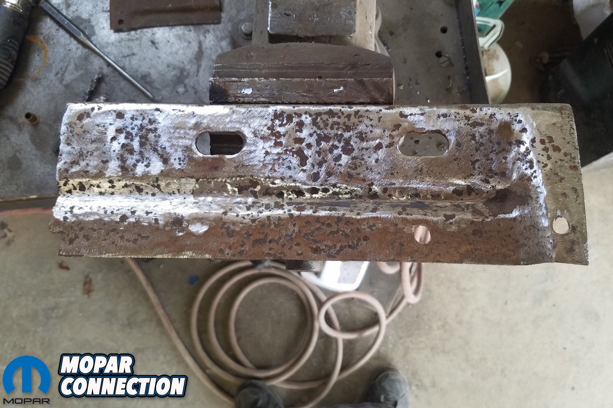 Above left: The factory bumper reinforcement plate is cleaned up as best as we could. Above right: Here’s another shot of the cleaned up bracket. We added the vertical slot to weld through to reattachment.