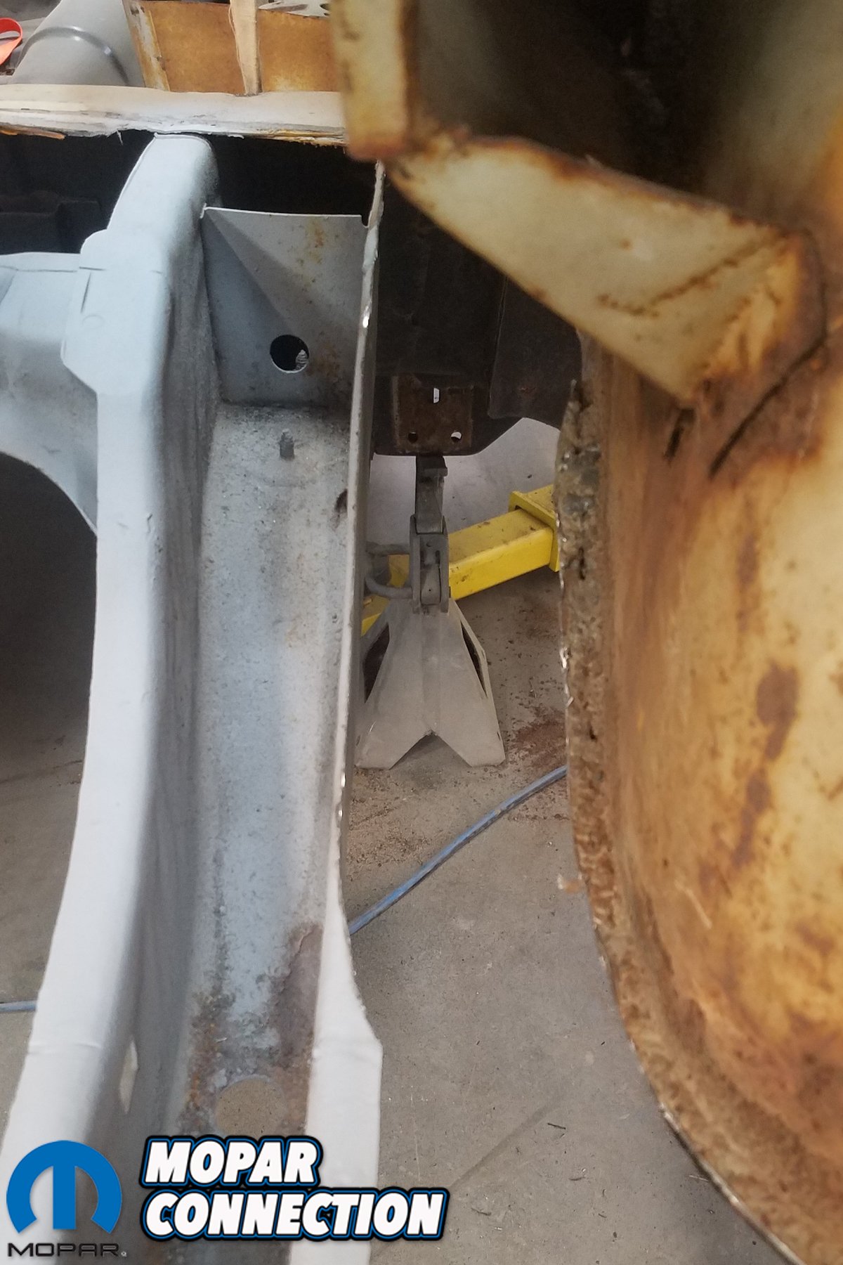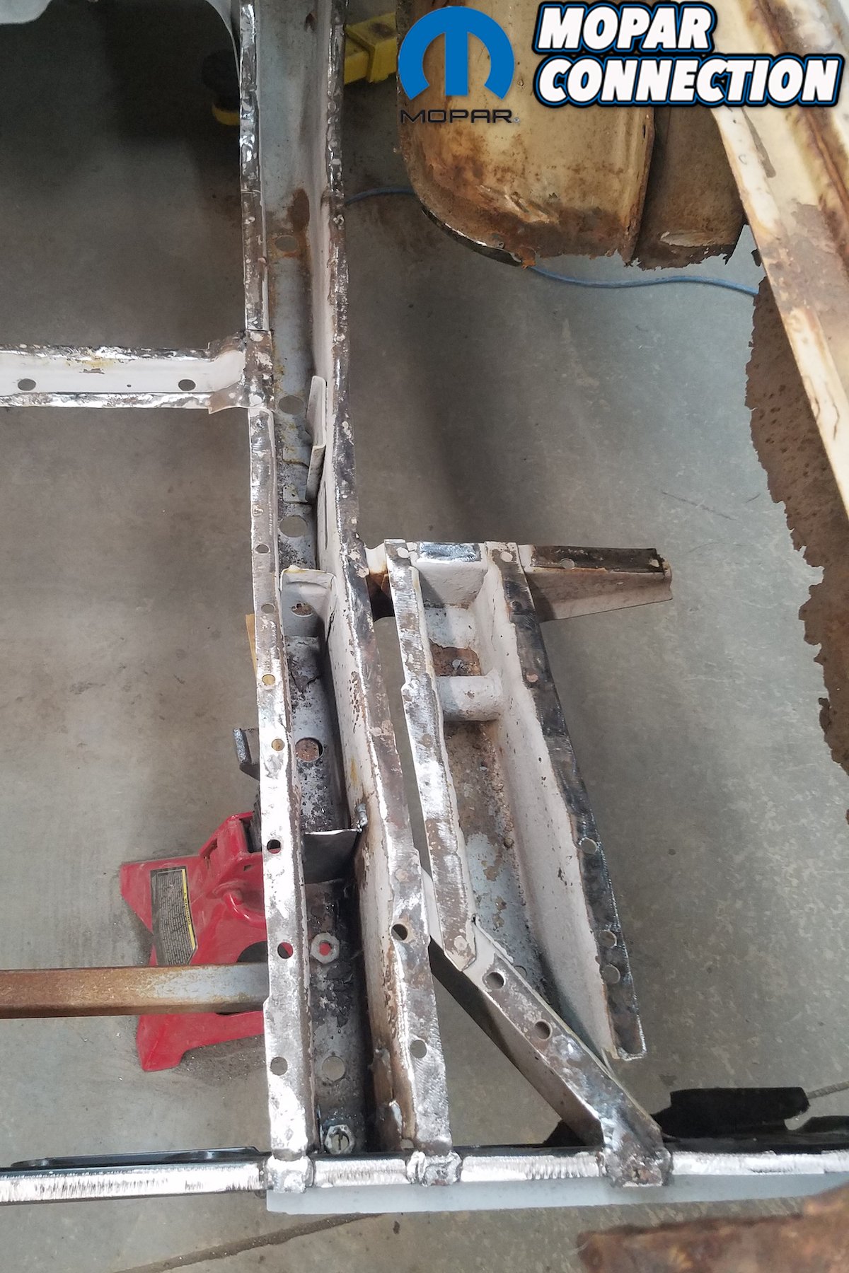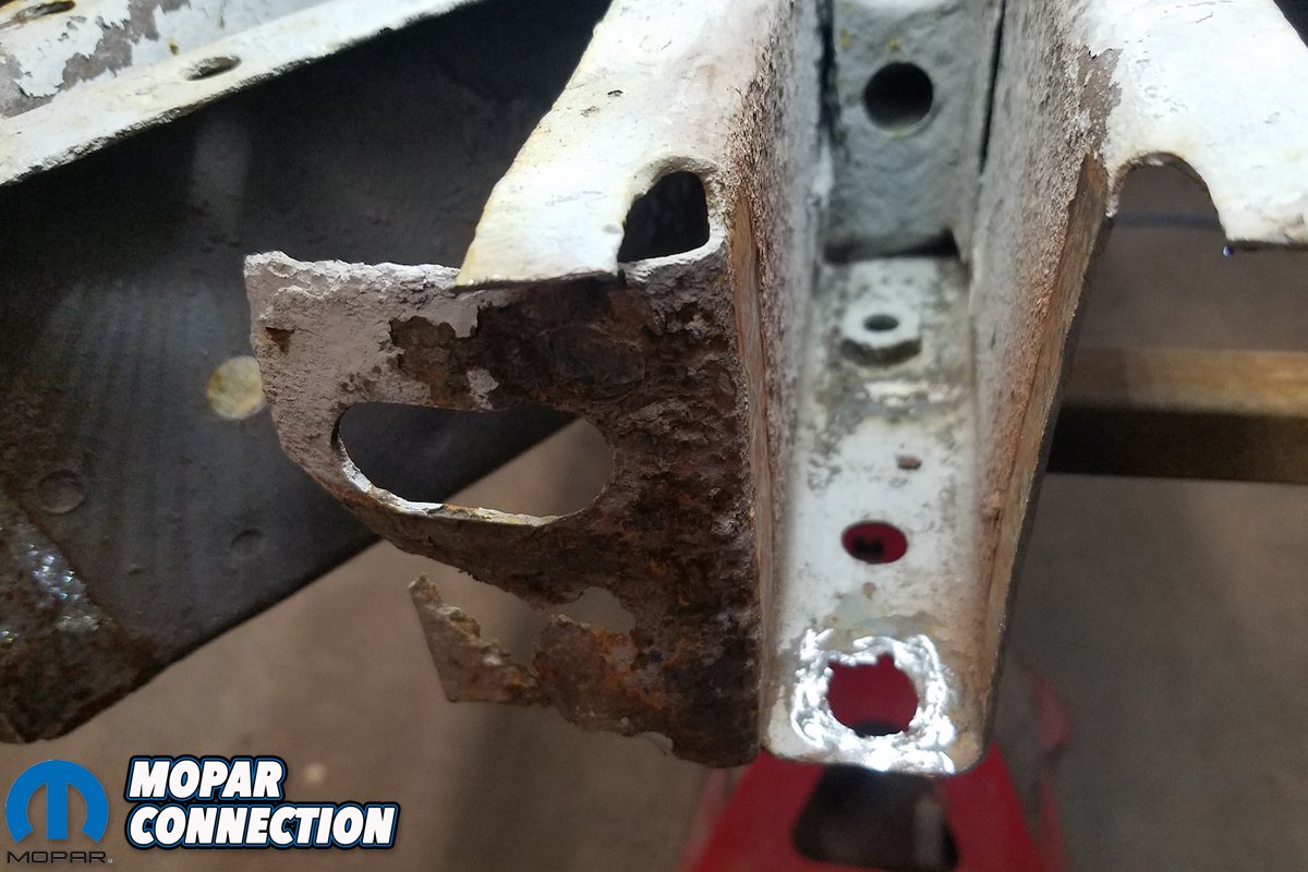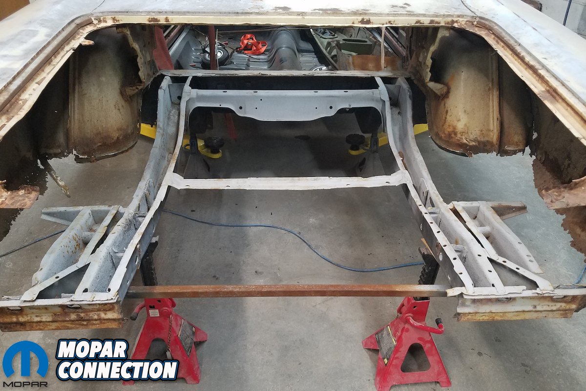 David Chamberlain of All Customs Restorations laughed when the car first arrived. “Well, there’s not much left is there?” he joked. I didn’t laugh. Ensuring that the B-body’s frame rails were both straight and level was first, and we documented David’s process earlier. Next, required that we tie the rear frame rails together with a new rear cross member.