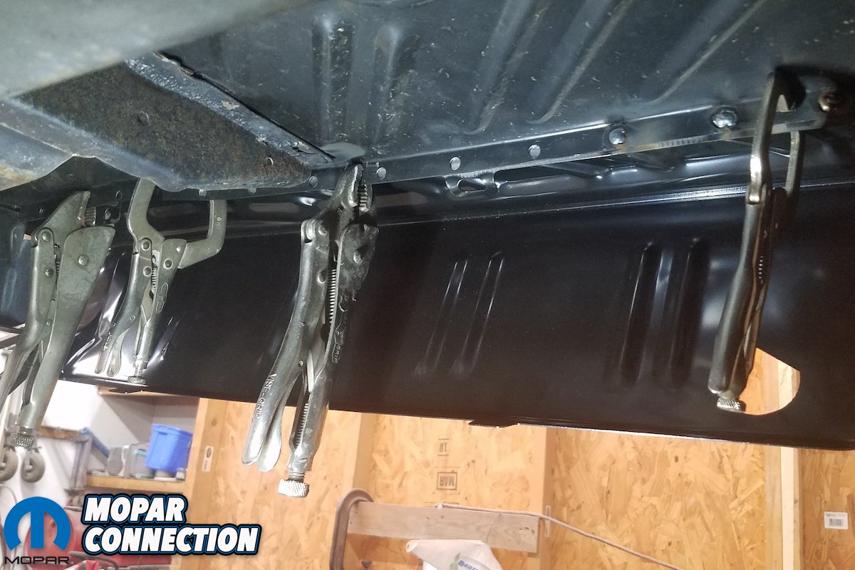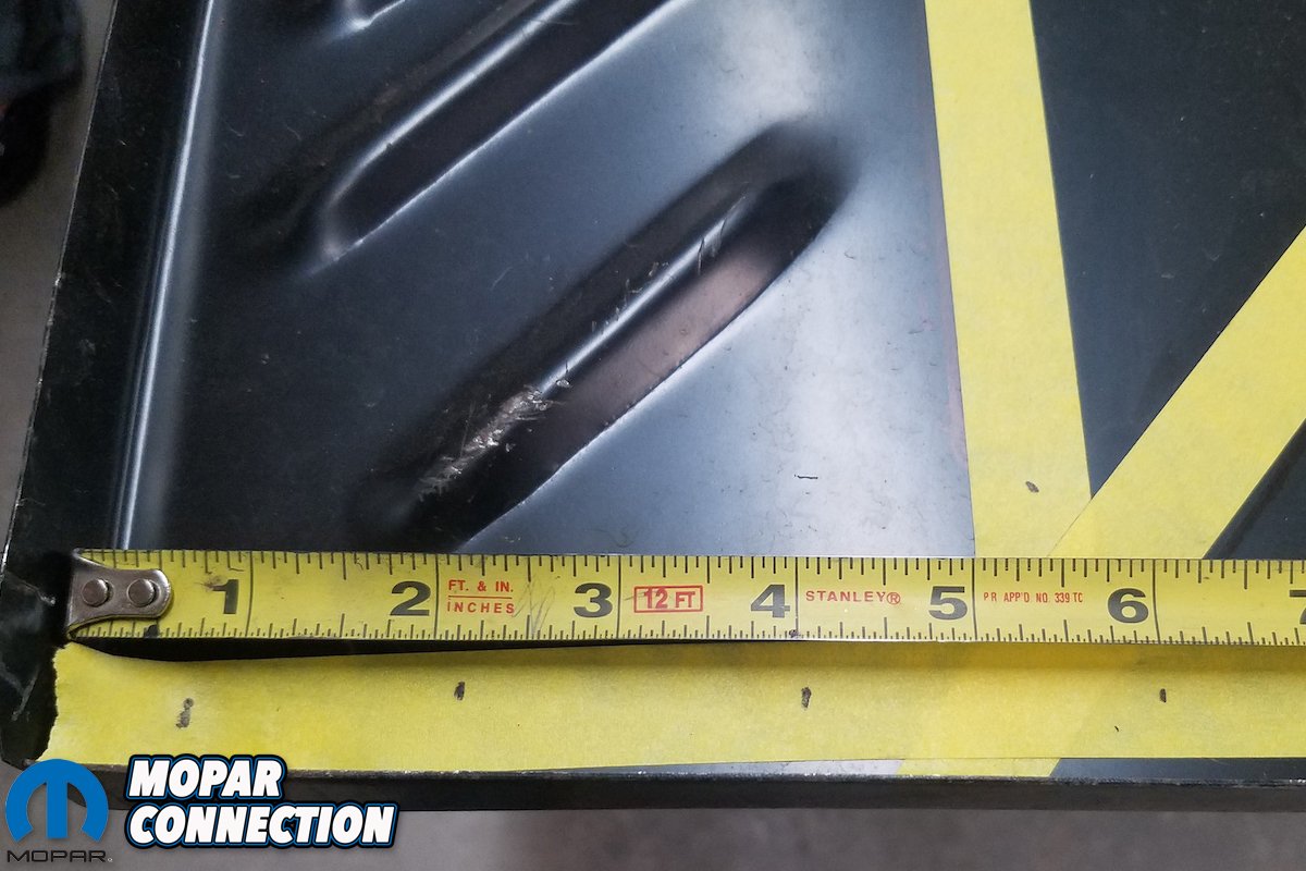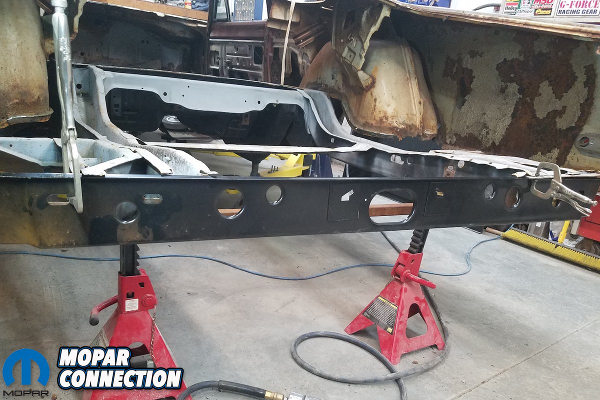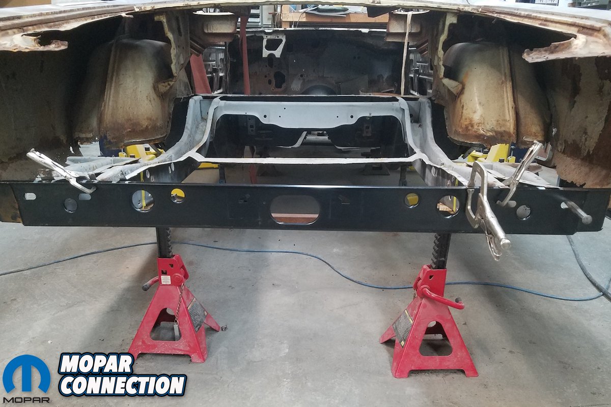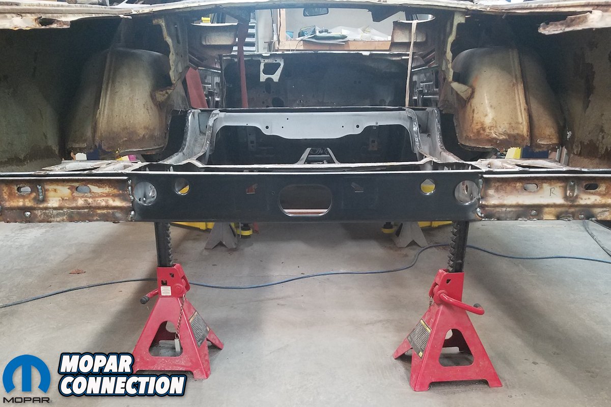 Each step required several measurements from a variety of angles to ensure that the Super Bee remain square. Without the aid of a frame table or jig, this challenge was made doubly crucial. Once the rear frame rails are properly tethered could we begin installing the one-piece trunk pan.