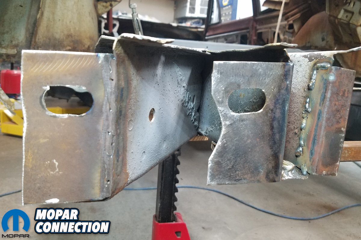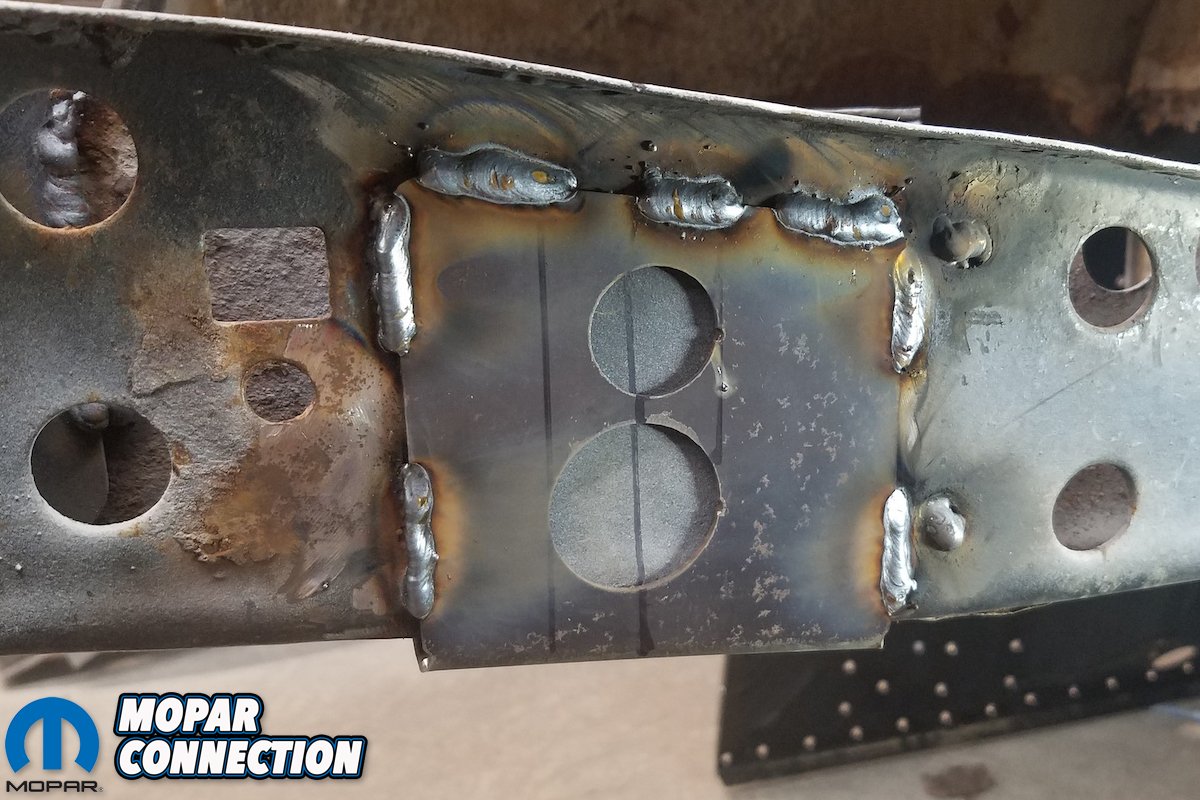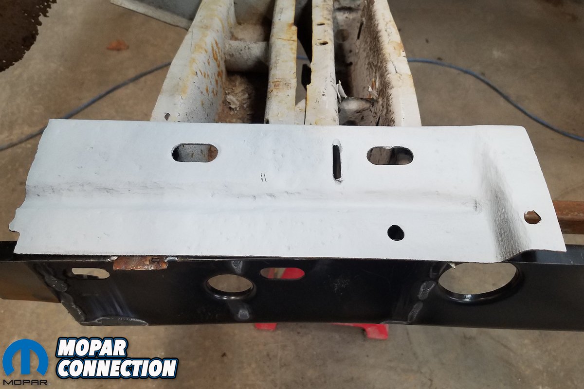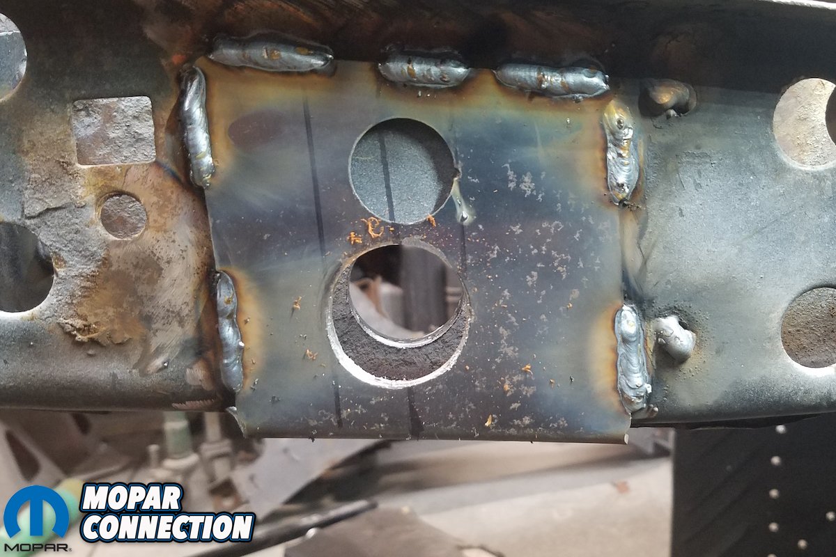 Above left: We applied a coat of weld-through primer prior to welding. Above right: The reinforcement plates welded to the cross member.