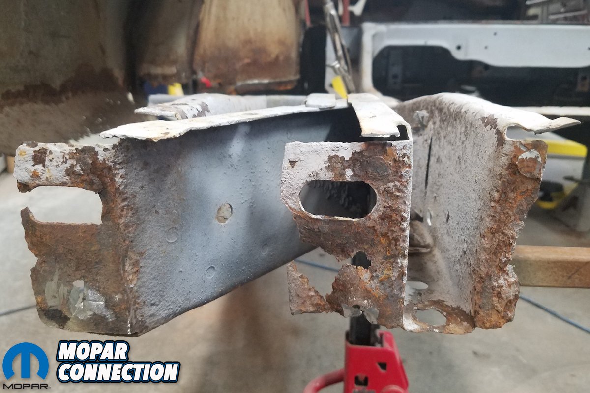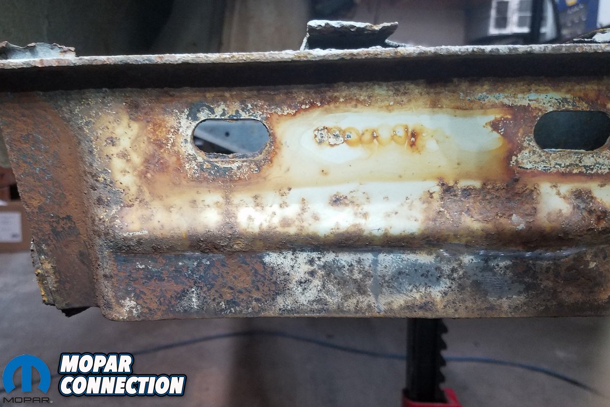 Prior to doing so, we needed to see what of the bumper brackets we could preserve. The pitting was bad, but the metal wasn’t corroded enough that it couldn’t take a weld. With the reinforcement bracket plates removed, we also could patch up the ends of the frame rails, repair broken flanges and replace what we could.