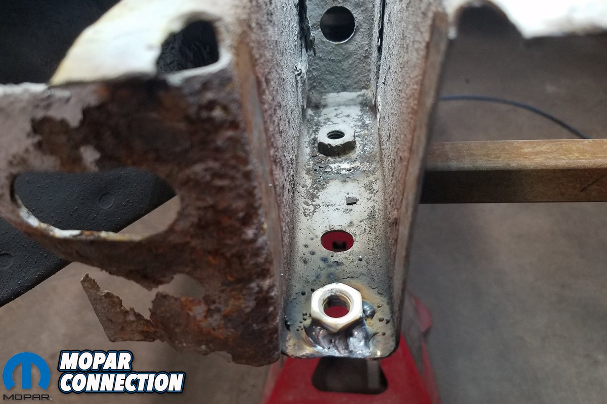 Above left: The nut for the bumper bracket is missing and needs to be replaced. Above right: The replaced nut is welded in place, letting the bracket be reattached later.