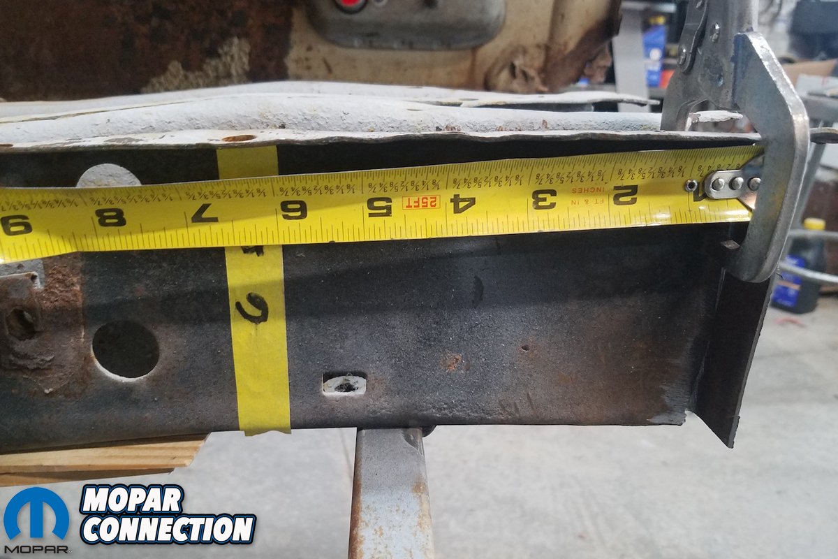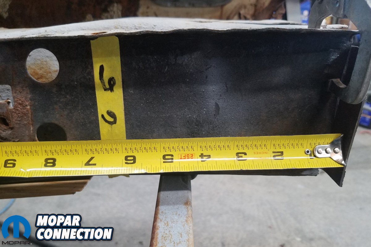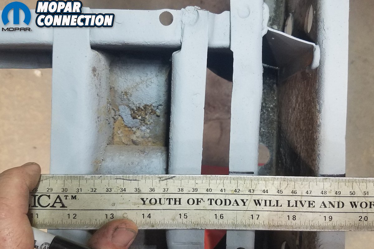 Above left: Prior to any cutting or welding, we make sure to take measurements of inside of frame rail to reference. Above right: Yes, 1/8th-inch tolerances are within spec. Believe it or not, 1/2-inch was passable back then.