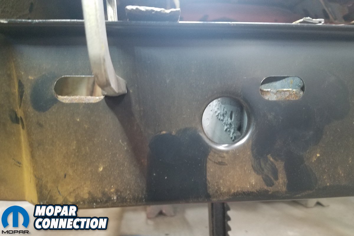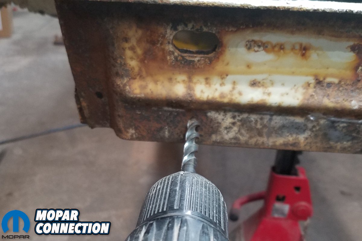 Above left: Now we welded the U-plate to the frame rail aligned with markings on rail. Above right: Next, we drilled out the bottom hole all the way through the rail.