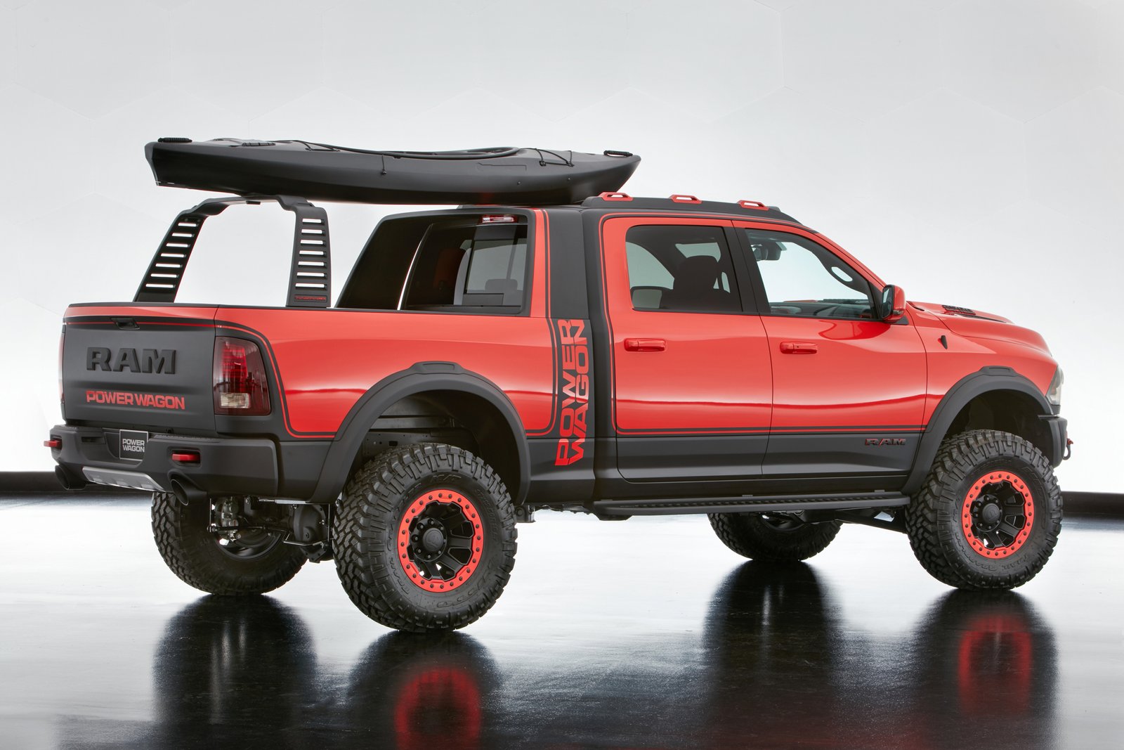 Powered by a 6.4L HEMI engine and six-speed automatic transmission, this one-off Ram features Mopar concept and production products such as the bed mounted ‘slide up and stow’ sliding RamRack which securely stores toys to fit a variety of lifestyles. The RamRack is designed to neatly slide up and stow under the cab’s sail panel when not in use and works in harmony with a RamRack roof system that locks down items with six unique tie downs.
