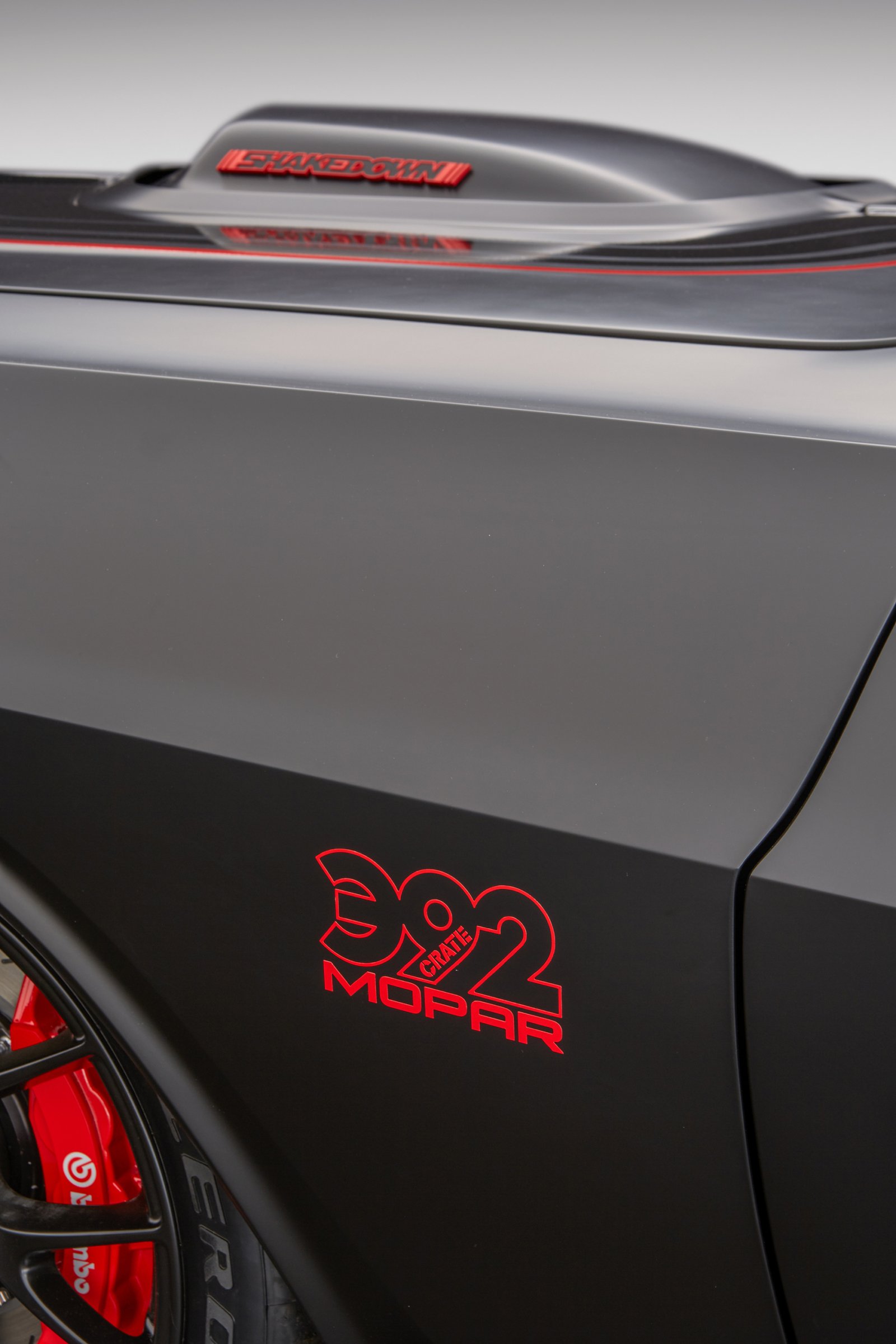 The Dodge Shakedown Challenger perfectly weaves together design cues from both the classic and modern Challenger. Starting with a 1971 Challenger body mounted on a hand-built custom removable frame, the boys at Mopar shaved down the door handles, drip rails and fuel door for a sleek look. Once it was smoothed out, the body was shot in a coat of black paint that Mopar likes to call “Bitchin’ Black.”