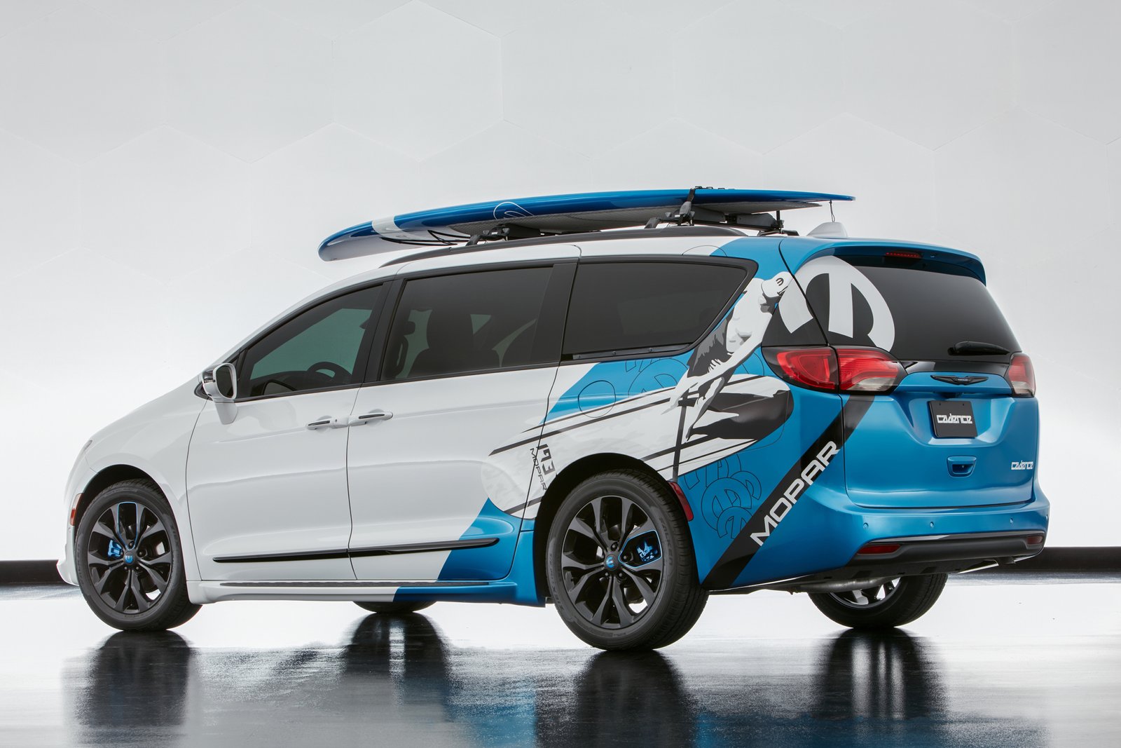 Wrapped in custom Mopar graphics on top of a pearl white paint job, Mopar has created the true “family-room-on-wheels” with their Chrysler Pacifica Cadence concept. Going with a ‘boarding’ theme, this Pacifica features a Mopar/Thule paddle board/surf board carrier on top to transport a large 9-foot paddle board re-branded with Mopar graphics.