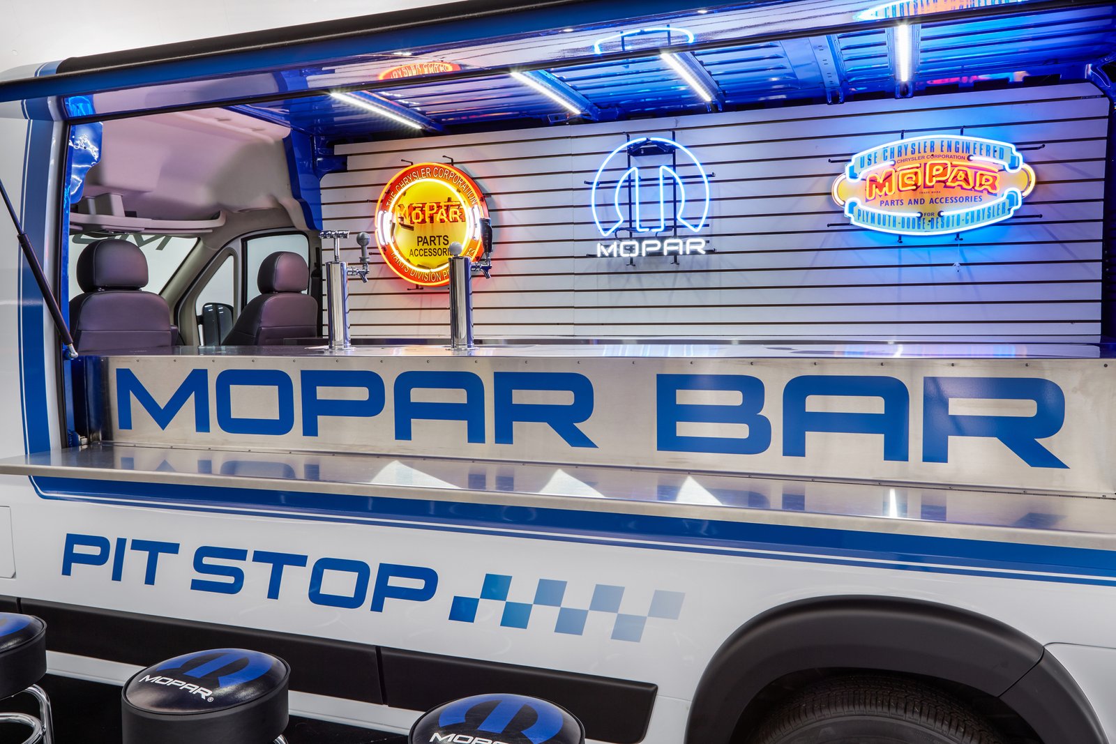 Featuring the Ram ProMaster’s versatility, the ProMaster Pit Stop is ready to entertain. Fitted with a hinged door on the driver’s side, a drop-down bar counter hinges and opens out from the side as well. The interior has been modified with keg refrigeration capacity to serve beverages from four on-board Mopar shifter handle taps. Also fitted to the interior cargo area is a slotted board displaying Mopar gear and vintage neon signs. The Pit Stop rides on Mopar concept 20-inch Satin Black lightweight wheels and the entire exterior has been done up in Mopar colors and custom graphics.